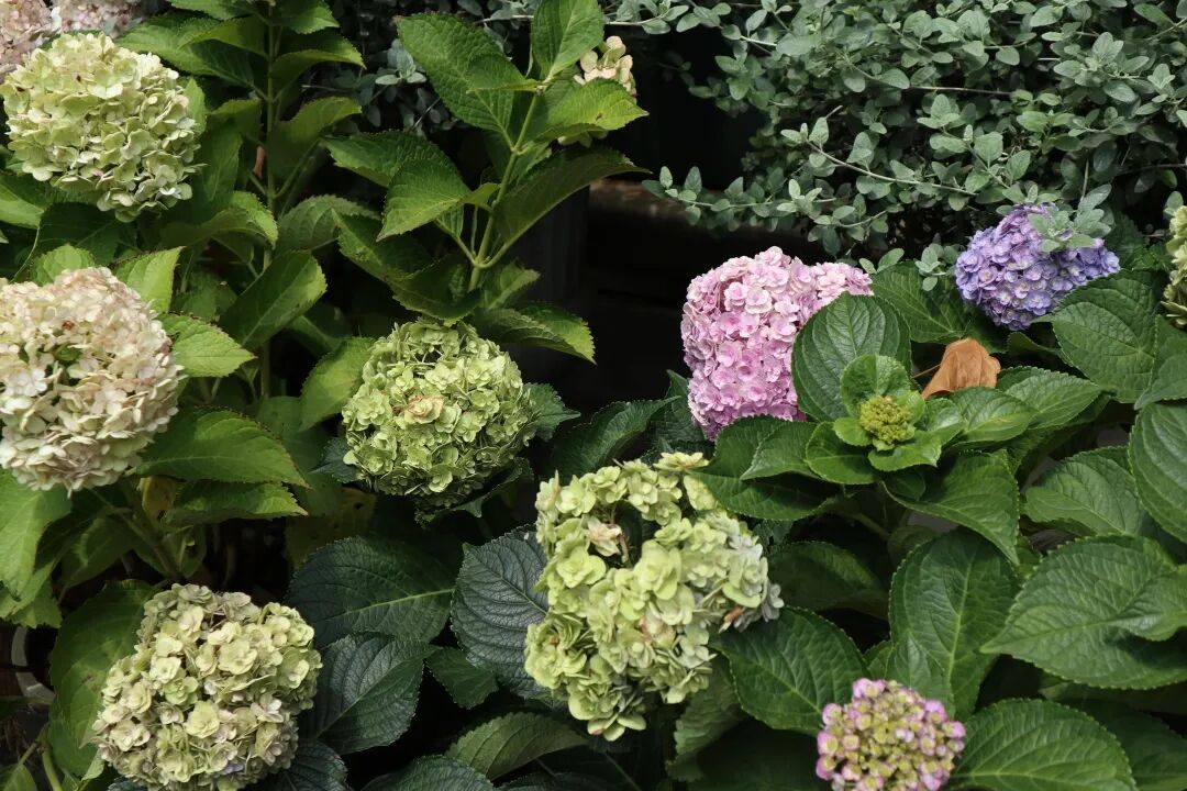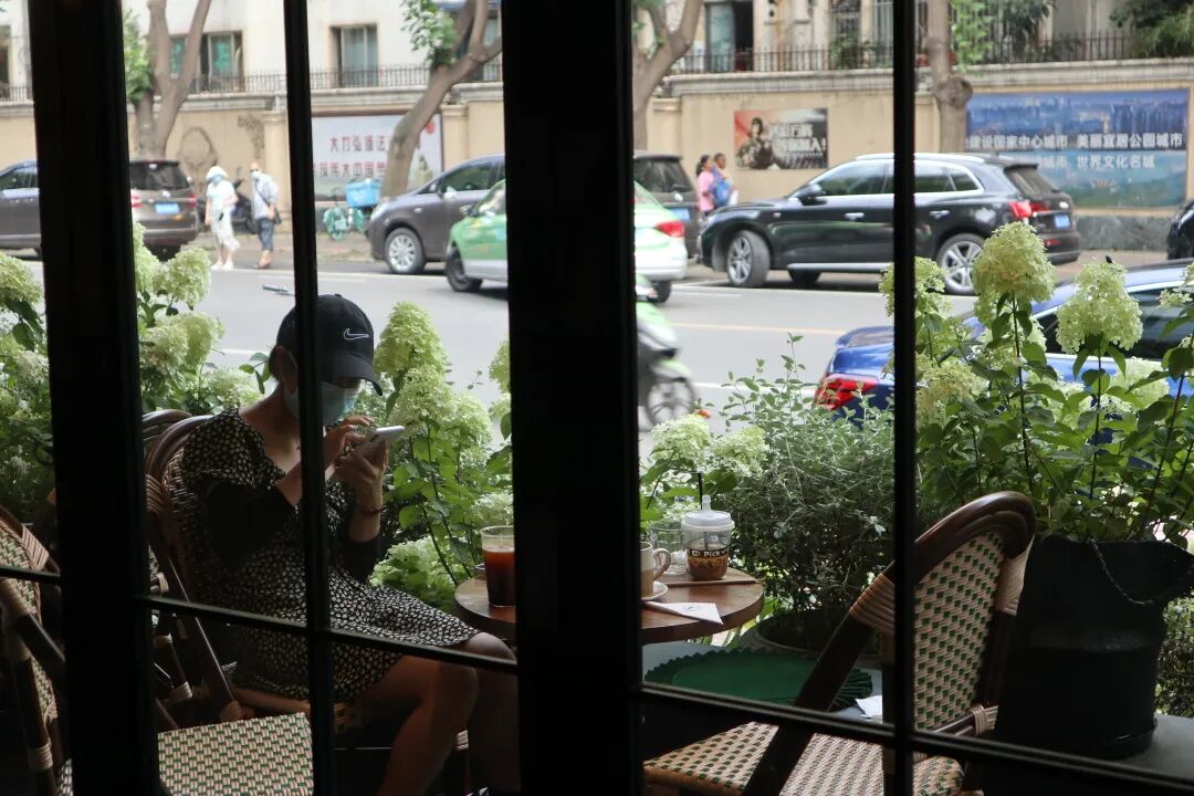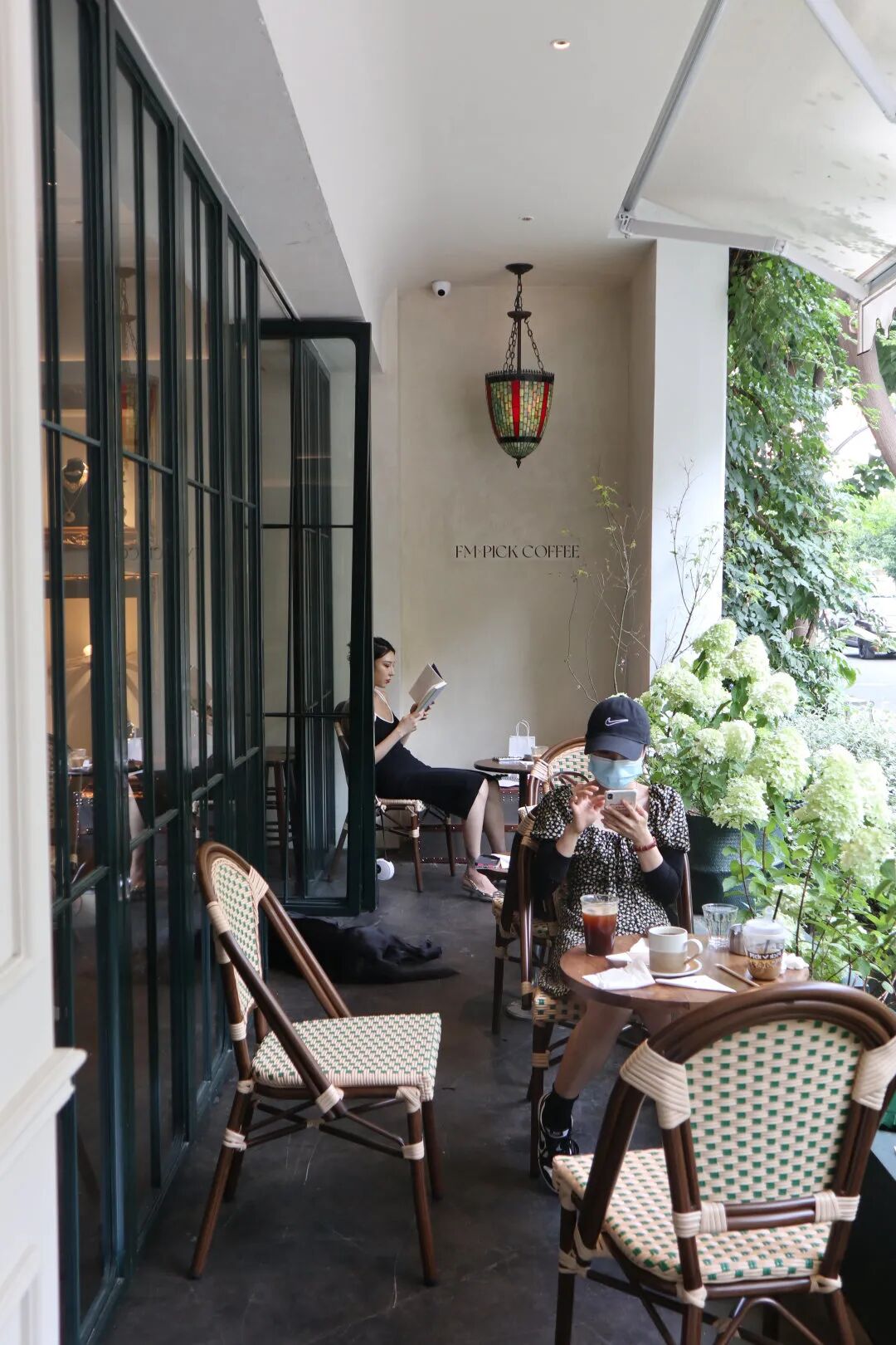 改造过后的店面充满了法式风情,与桐梓林的欧洲风情街道不谋而合。门口右侧是一个外阳台,可以坐在这里晒太阳,看着人来人往,近几年流行的欧式桌椅也让人有着置身于欧洲街头的氛围感。而一旁布满的硕大丰满的绣球花,作为自然的隔断,给到了客人一定程度的私密性,也让空间变得灵动。