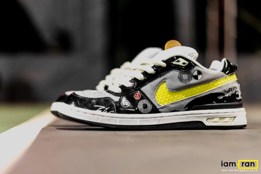 他当时并不知道这双 FLOM 的价值之高,因此也没有刻意地将它保持为全新的状态,而是直接拿去滑板了。如今再回顾当年,他也感到后悔,没能把这双鞋留存下来。