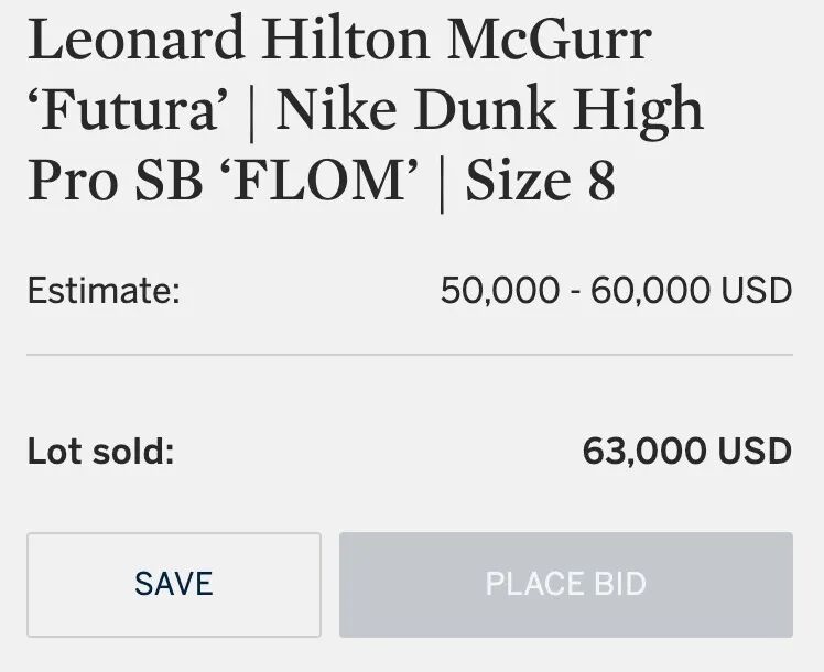 2022年,苏富比为纪念 Nike SB 成立20周年,举办了以 SB Dunk 为核心的线上拍卖。FLOM 也是众多鞋款中最受关注的一个,并且这次的拍品除鞋之外,还附带 Futura 亲签的滑板与原盒。经过激烈地竞争,最终以945000港币的价格落槌,也打破了两年前自己保持的纪录。