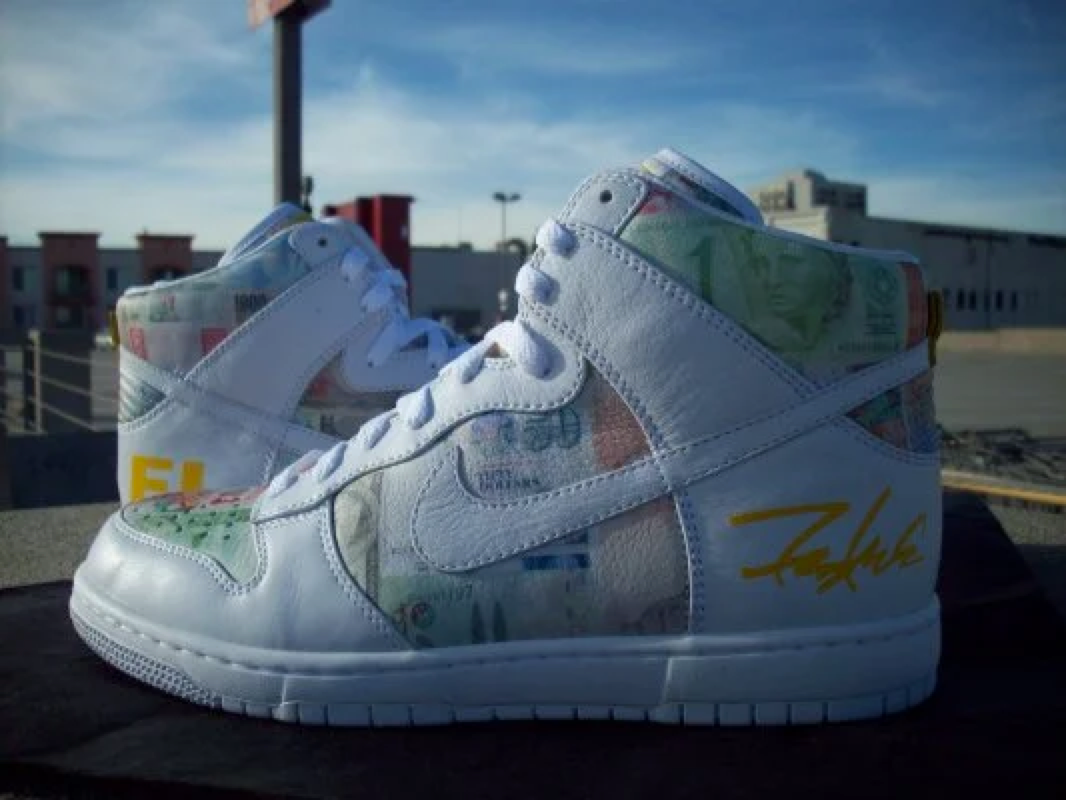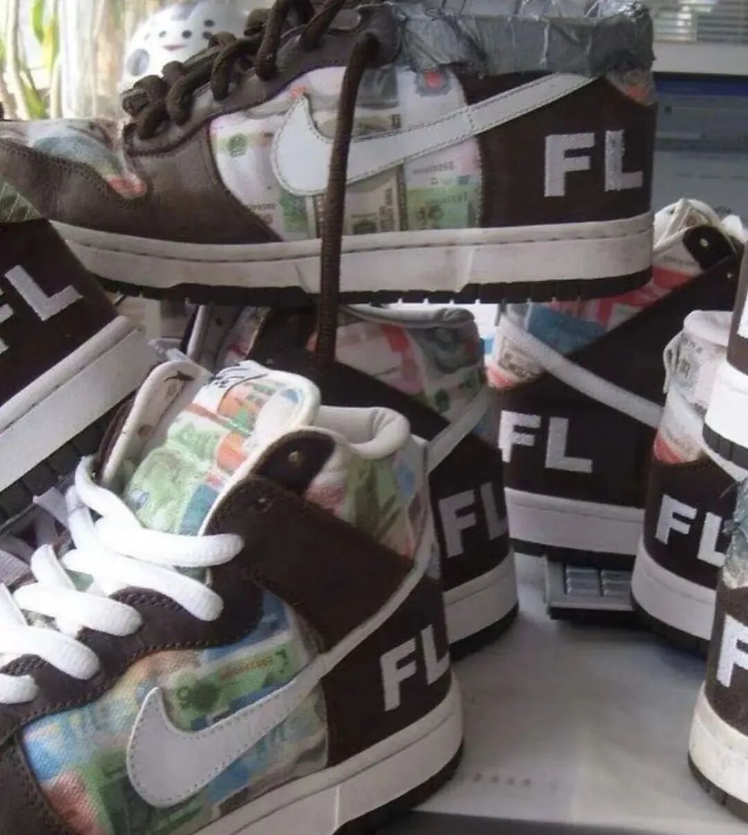 2004年,为纪念知名涂鸦艺术家 Futura 的个人品牌 Futura Laboratories 位于日本福冈的店铺开业,Nike SB 与艺术鬼才再度联手,创作出一款经典之作—— Nike Dunk High Pro SB "For Love or Money" (简称 FLOM)。