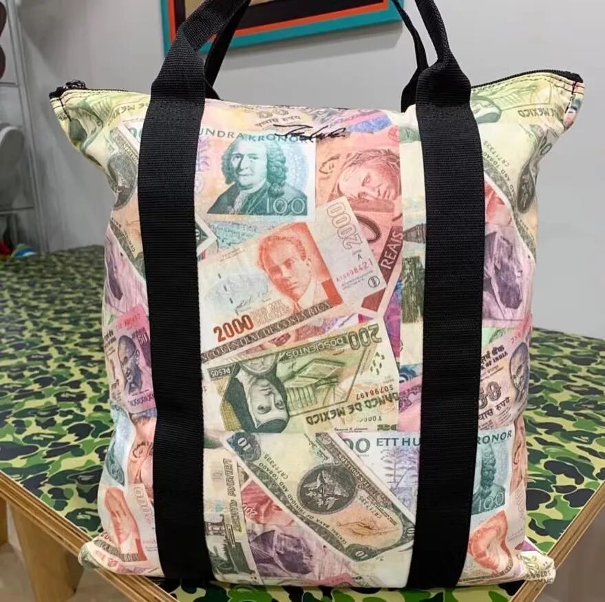 同样是 Futura Laboratories 推出的周边产品,帆布材质的托特包上布满了各国货币的图案,拉链口附近还加入了 Futura 的签名刺绣。