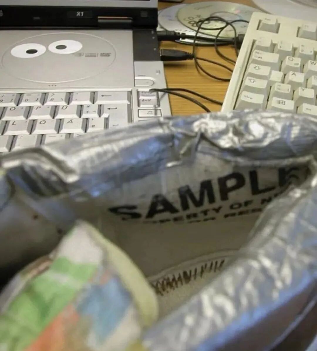 通过国外收藏家的分享,我们才有机会看到了这款鞋的样品版本,与正常流通的24双独立开。仅从图片中观察,外观方面其实与最终版没有什么区别,只是在内衬中打上了样品的钢印。但有一点十分特别:这双鞋的鞋帮被剪掉并且被防水胶带粘了一圈,变成了"中帮版本"。关于这双鞋的曾经的主人是谁,我们先卖个关子。