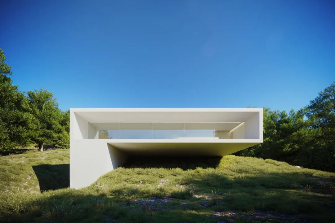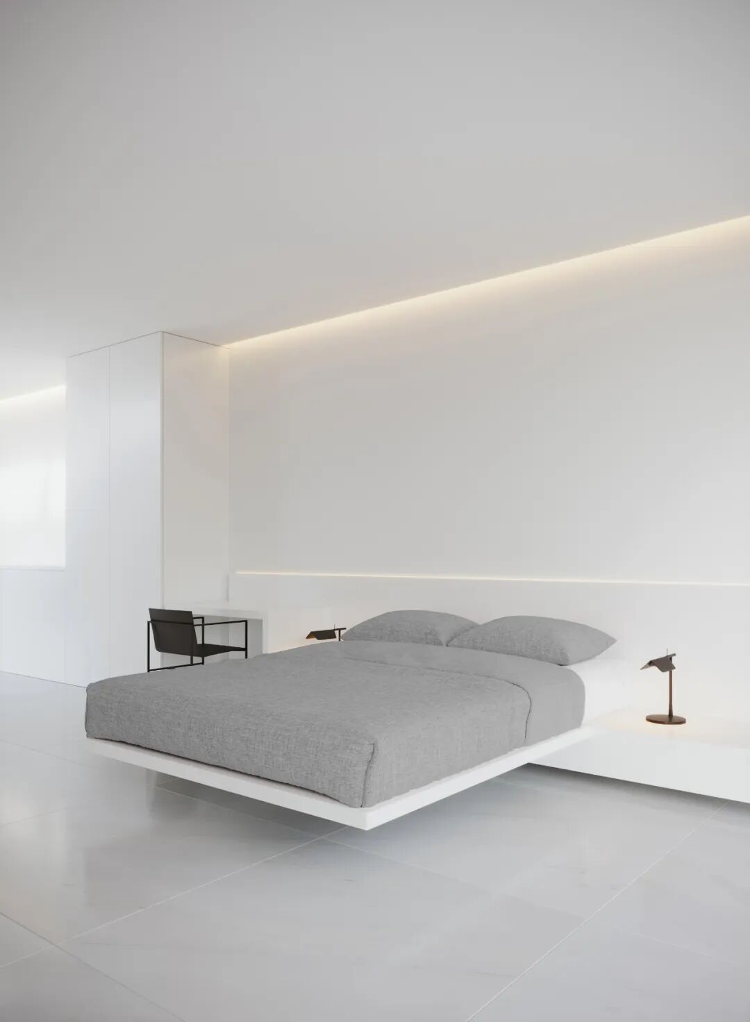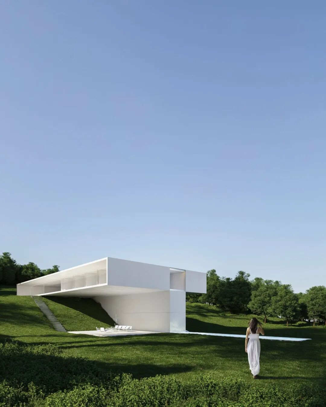 整座建筑采用纯白色调,使支撑结构与建筑融为一体。卧室面向景观开放,并设有露台为其遮阳。