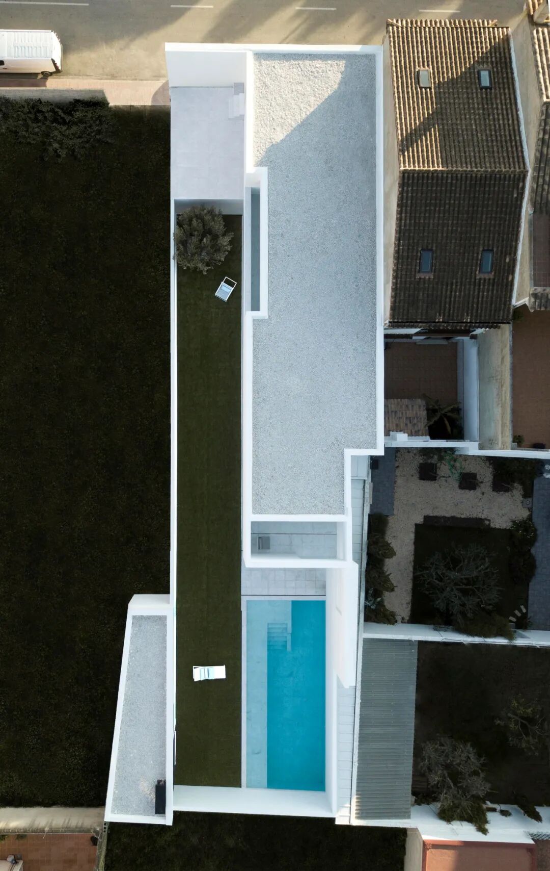 泳池放置在一个较低的平面,建筑的混凝土结构由光滑的白色石灰粉刷。其余材料,包括墙壁,路面,屋顶上的碎石,都维持着相同的颜色,尊重当地的传统建筑,同时和谐地融入周围建筑。