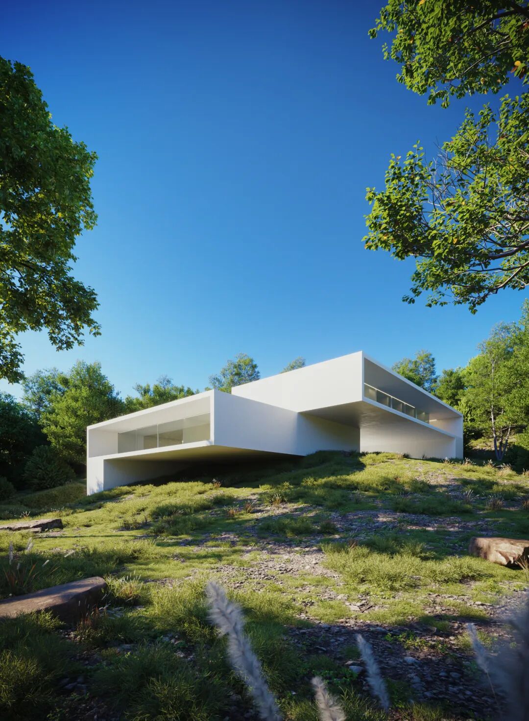 住宅享有优越的自然景观,建筑被放置在陡峭的斜坡上,由垂直于地面的结构进行支撑,南向享有极佳的景观视野。
