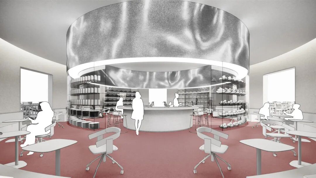 随着重要性的与日俱增,“办公厨房”不再存在于角落空间,而是成为空间规划的主角。模型正中央,圆形吧台如同一间西式自助厨房,玻璃搁架上可放置各类茶饮、轻食,上方环幕还可以展示企业信息、空气指数或食物标签。红色区域向外辐射,圆环周围变幻出各式各样的功能场景,人们可以根据自身需求,在“洽谈沟通”、“小型派对”、“运动休闲”等模式间自由切换。