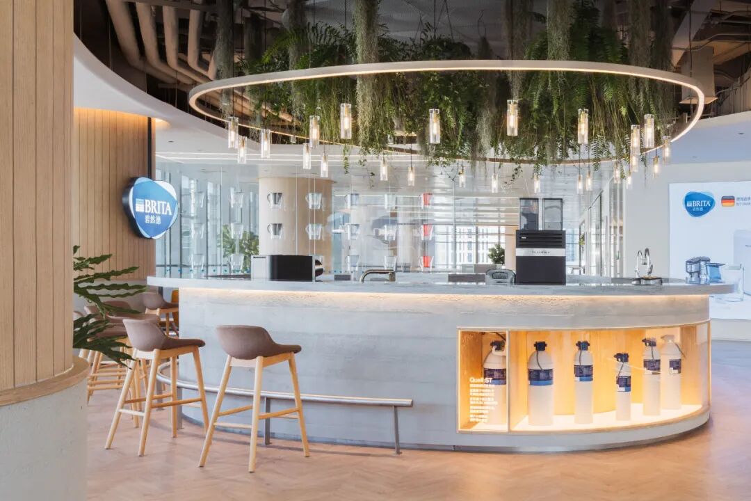 在开敞、明亮的空间内,设计师用3个点串联起企业文化,为Brita这一学习型组织提供支持创新的场景。沿着清晰的动线,Brita的品牌价值观和企业荣誉一目了然地展现在来访者眼前,其种类繁多的滤水产品不仅秩序井然地陈列于展示柜中,也被巧妙地植入吧台区域,让人们在使用过程中体验产品的卓越与美好。