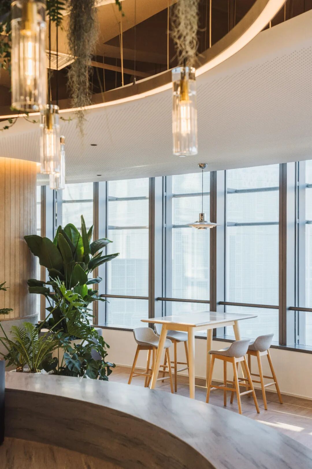 无独有偶,FTA的“办公厨房”策略同样显现于罗氏北京新办公室的设计中。在融合了“工作、学习、社交、协作、专注”等场景的多功能区,设计师将开放式茶水柜、休闲吧台、窗边卡座和活动家具有机地结合在一起,从而构建出灵活、动态、多元的员工社交中心。