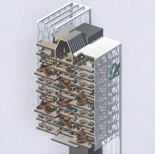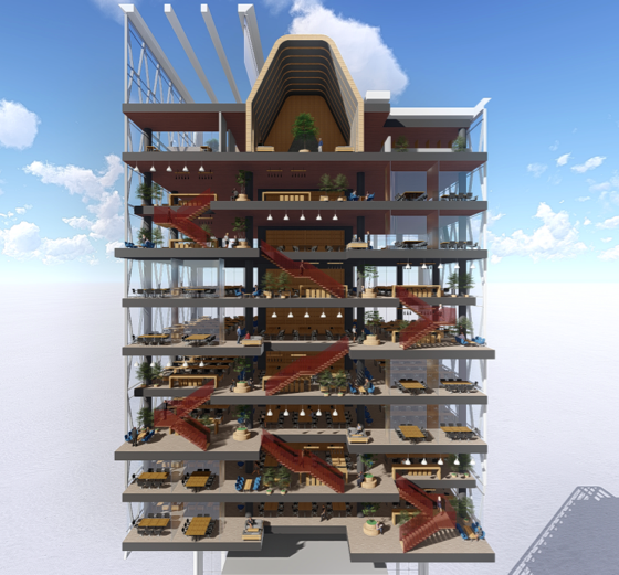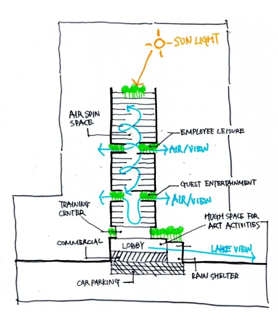 雅兰总部大厦需包含大堂、研发办公、商业、食堂、宿舍等功能空间。建筑形态似“山”之形,不同标高的空中花园,将不同的功能空间进行有机划分。不同的空间形态似“流水”之意,各种空间之间相互连贯与流动。