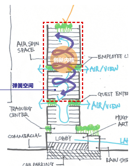 建筑设计引入一个螺旋状的“弹簧”空间,以“弹簧”精神为内核,利用不同位置的中庭串联各个楼层。中庭呈螺旋状的流通空间使得员工相互之间的交流互动有所增加,提高沟通效率,强化核心竞争力,以达到保持企业的活力和创新力的目的。