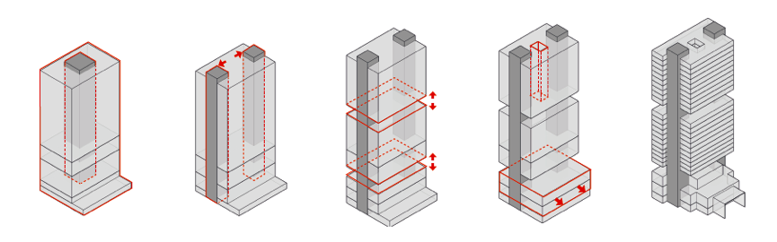 作为一个超高层建筑,雅兰总部采用双核心筒分开布置的方式,一方面实现复杂的功能需求,区分不同功能区的流线,另一方面得以最大效率释放核心空间的灵活性。