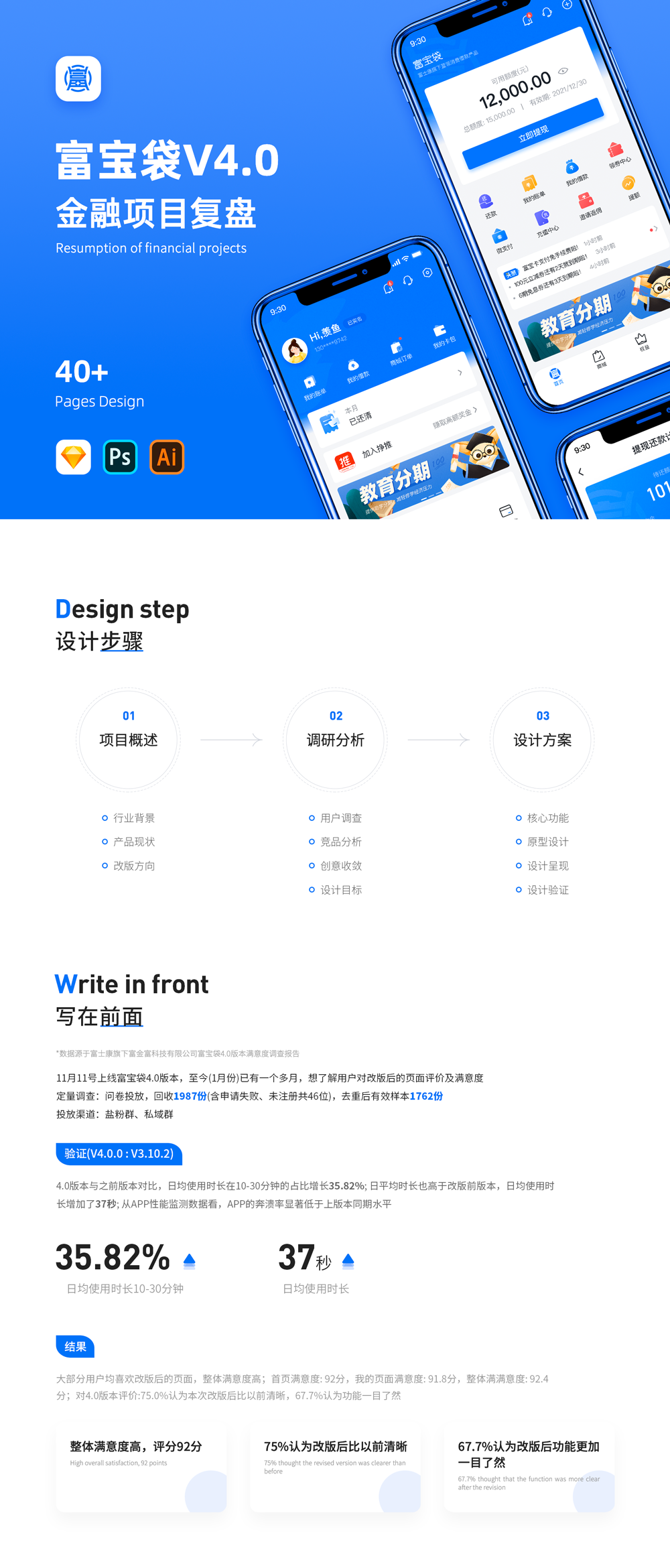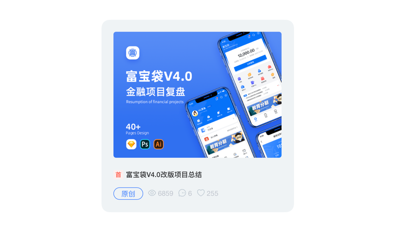 今天给大家推荐的是黑马家族的 @羡鱼L,最近输出了一套作品,富宝袋V4.0项目设计总结。熬了N多个夜晚,牺牲了N多个周六周日后终于完结。上线之后获得了众多好评,整体满意度回收评分达到92分。该作品发布在UI中国也获得了首页推荐,欢迎大家下载体验。
