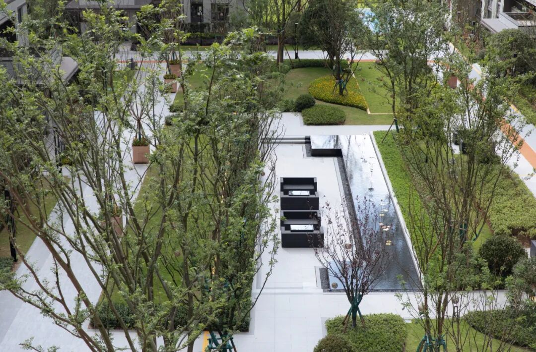 景观设计重构传统古典园林布局,呈现上转译东方传统园林的自然格局,结合建筑的设计语言和运用现代艺术手法,以直线线条线性呼应建筑形式,继而营造出穿过门廊、进入庭院、步入门厅等系列的归家序列,形成完整的空间布局和序列节奏,实现人与文化和自然的对话,赋予未来业主一方清幽雅致的理想居所。