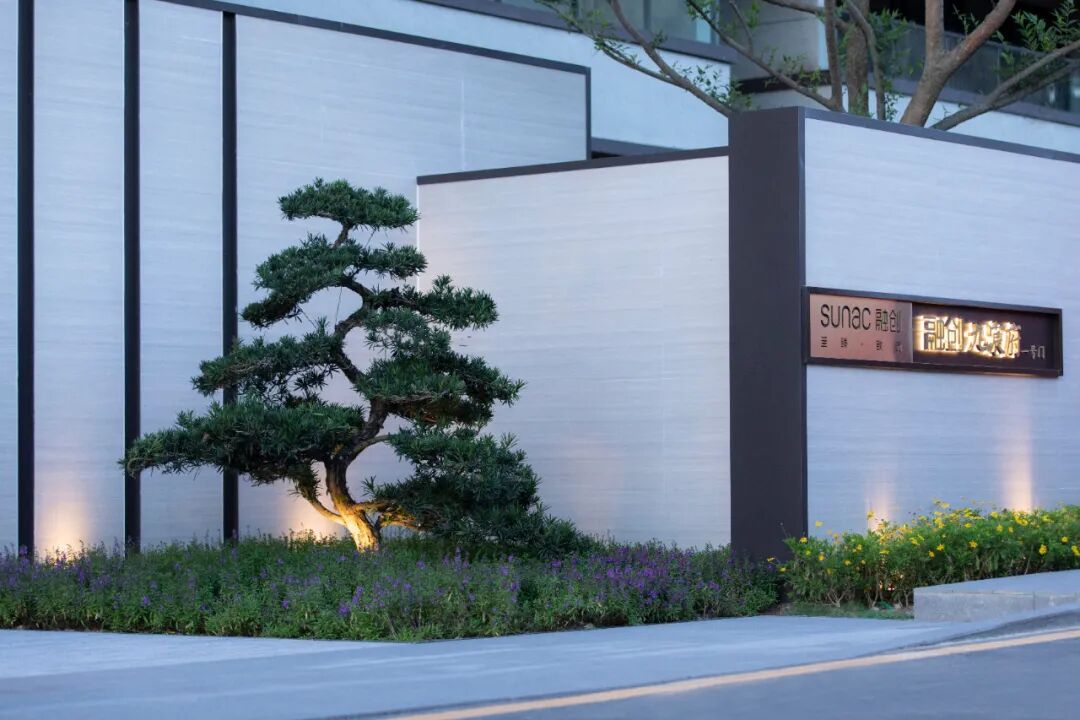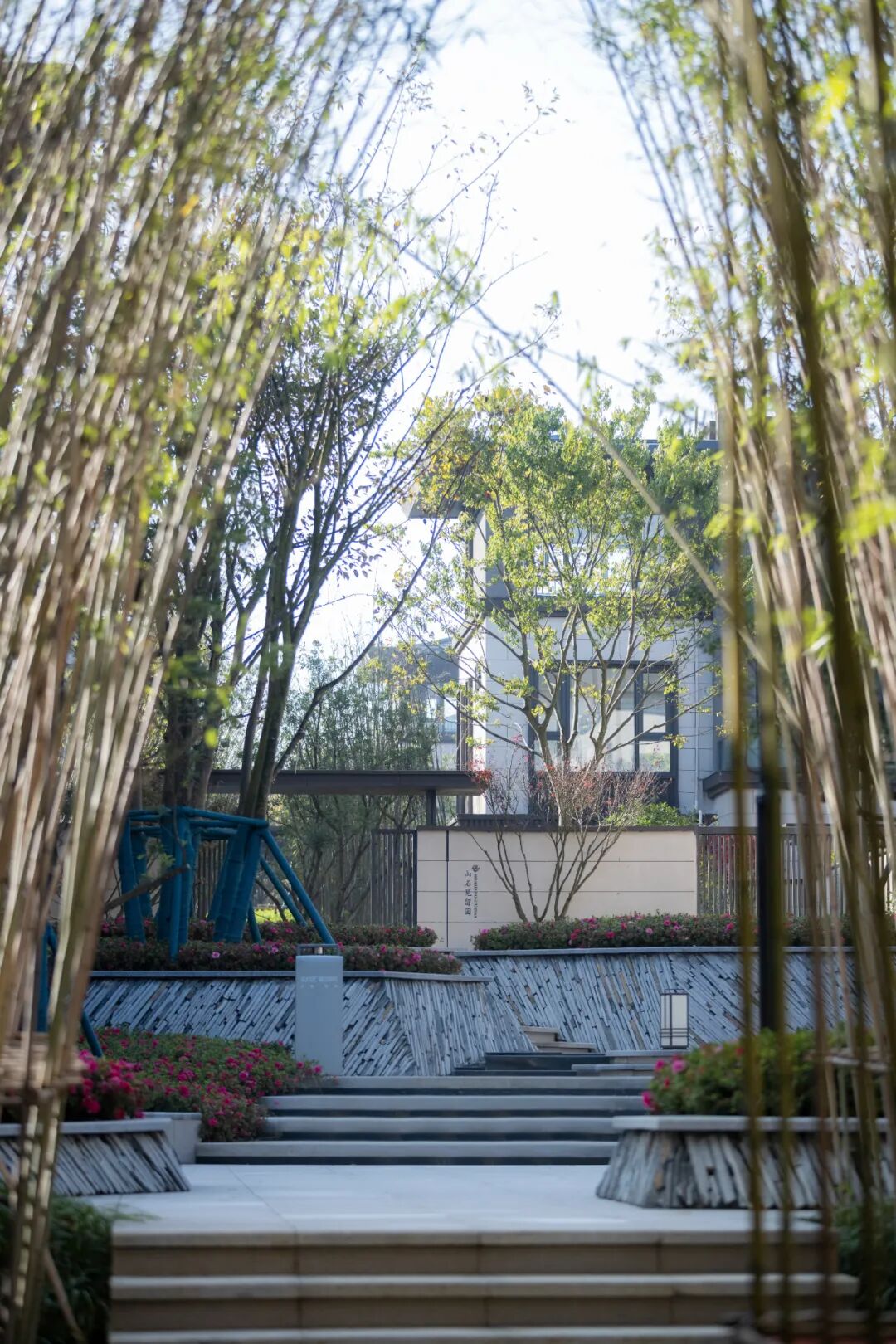 迎宾夹道端视线连接的是一面景墙与花境组团,设计在有限的空间里做足精细景观,注重归家仪式的同时烘托归家的温馨氛围。