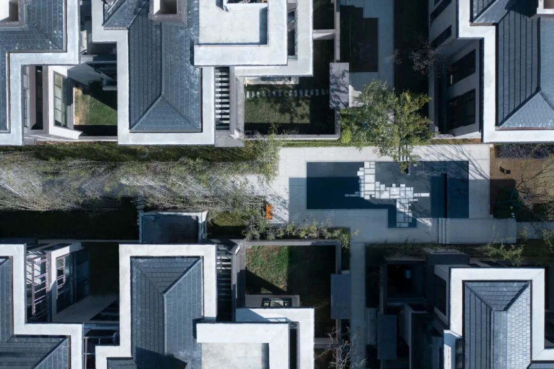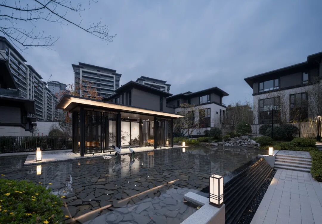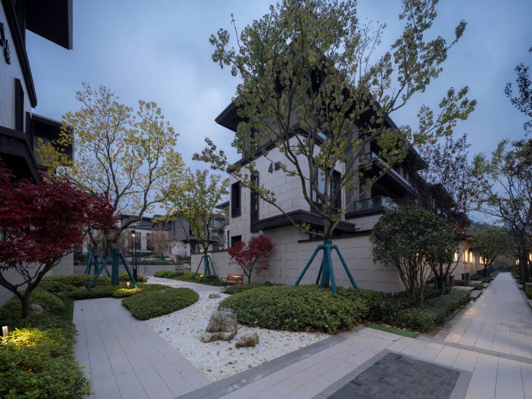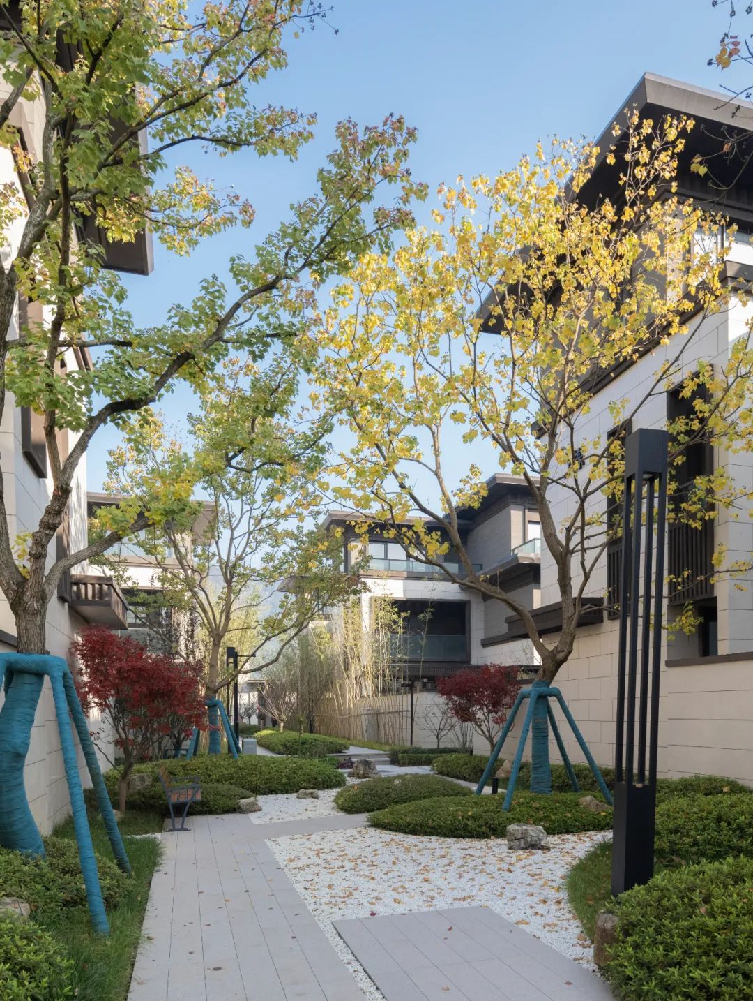 景观设计重构传统古典园林布局,呈现的形式上,别墅组团是借鉴苏州四大园重构当代四大园:精筑构狮林、山石见留园、文墨印拙政、良木显沧浪四个院落,营造东方美学园境。别墅区以三大轴线(十字府院轴、绿廊纯林轴、康体轴)串联四园、六庭、九巷,形成三轴构天地,门庭显富贵,四园显宅府,四庭文艺浓,九巷觅知音的景观结构,借鉴古典园林的造园手法,实现现代与传统的碰撞,打造区域独有的现代中式景观风格。