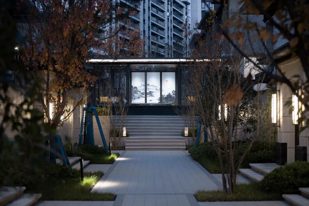 入口采用对称式设计手法,高低错落的景墙结合入口门楼,延展出空间的仪式感及视觉冲击力;立面上采用现代气息的金属格栅和传统气息的石材,使门楼的立面层次感更加丰富,营造府居大器风范。