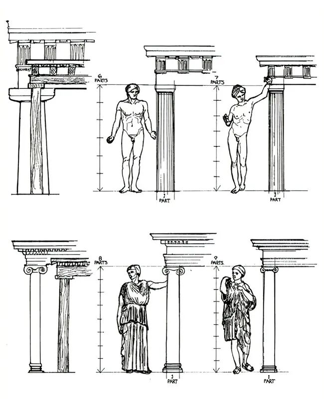 在形式上的划分可以找到维特鲁威的《建筑十书》中所说:多立克柱式是男性身体的象征,而爱奥尼和科林斯柱式则代表了女性身体。这无疑是通过形式的表象来对性别进行划分——前者比例粗壮,由下至上逐渐缩小;后者柱身比例修长,花纹华丽细密。