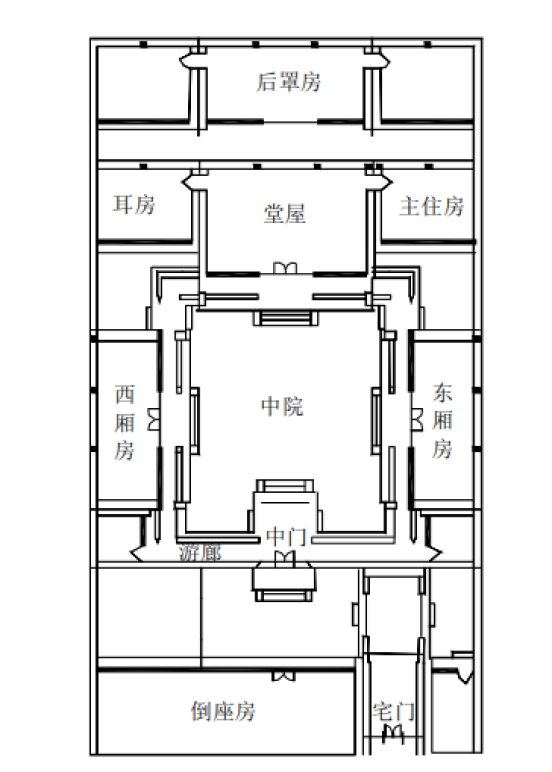 在中国明清时期的四合院建筑中的空间划分也强烈的体现了中国古代封建社会以“中门之制”来规范性别空间的特点。四合院正方后的一排房子为罩房,给家中女子居住使用。其中又以后罩房是家中最为私密的空间,未婚女性居住于此,进出都必须经过父母居住的正房。(配图)但不论是已婚还是未婚女性都被限制在中门之内,少有能出去的机会。