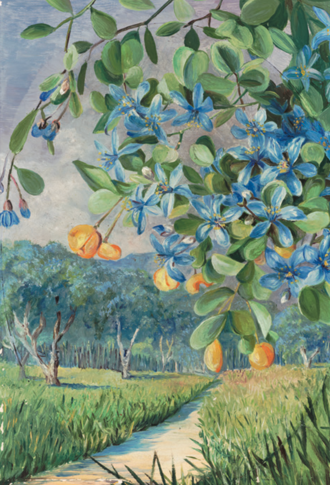牙买加的愈疮木的枝叶、花朵和果实,愈疮木 Guaiacum officinale。愈疮木是一种非常坚硬的树木,用于制作滑轮组、尺子、杵等物品。它的树干可以分泌一种叫作愈疮木胶的树脂。图\《花朵与探险》插图