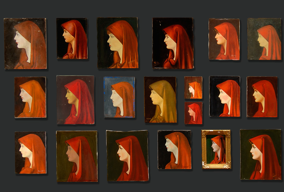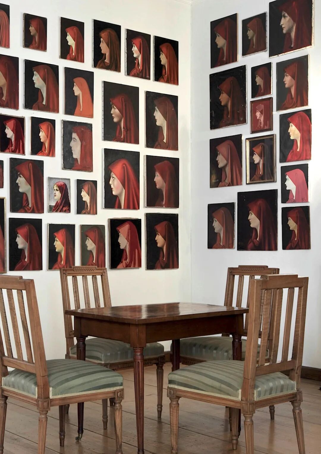 近20年来,艾利斯一直在收集圣法比奥拉 (Saint Fabiola) 的肖像画。这些肖像主要是业余爱好者的作品,超过370幅女性侧面肖像,戴着深红色的面纱,都很相似,但都不同。这些图像均基于法国现实主义画家让-雅克·亨纳在1885年创作的同名肖像。