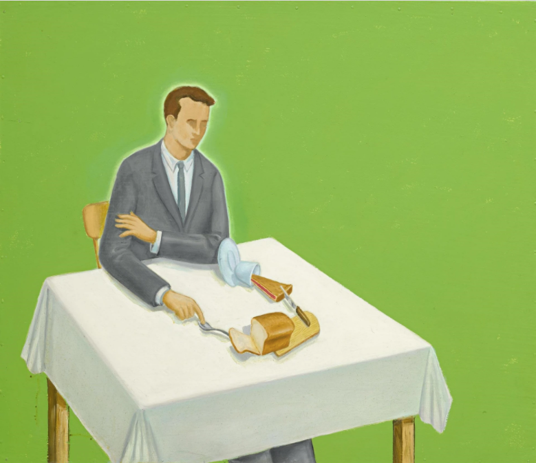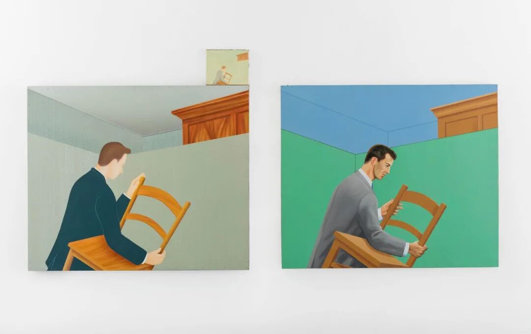 作品描绘了两个穿着灰色西装的男人,其中一个将脸藏在另一个的夹克后面。这些画作以限量版的形式进入市场,最终成为对膨胀的艺术市场的一种评论,更广泛地说,是对作者身份和原创性问题的一种评论。