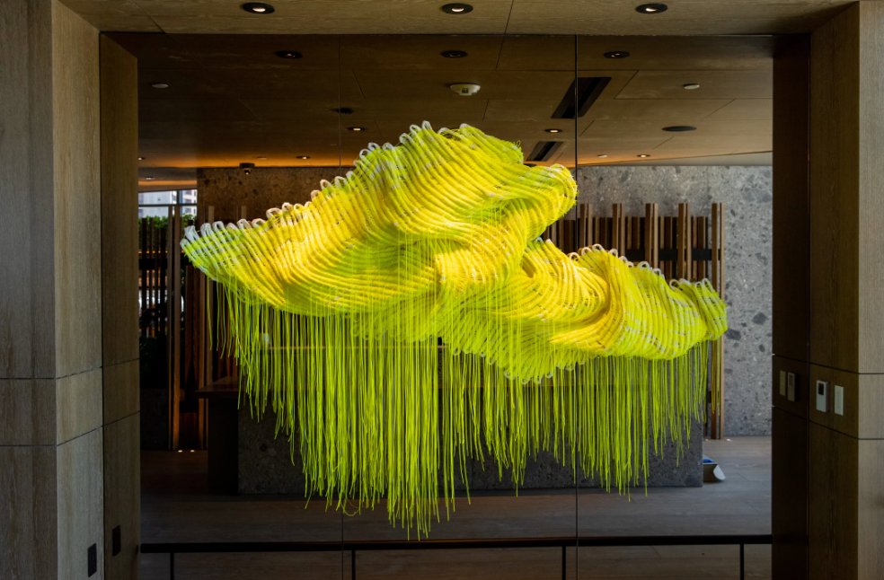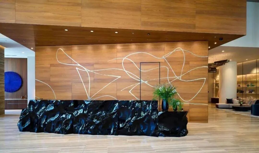 在整个接待处和大堂空间,艺术品都是与 Tatar Art Projects 的 Judith Tatar 合作策划的,展示了 Mimi Jung、Ben Medansky 和Brian Wills 等当地著名艺术家。这些现代艺术装置不但激发康莱德酒店的艺术氛围,也向客人展示了洛杉矶蓬勃发展的艺术产业。