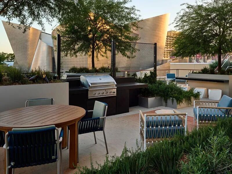 The Grand 中的许多酒店客房和出租公寓都可以直视或俯视音乐厅。就连盖里本人也为了能与自己最爱的建筑之一近距离观看,在住宅的较低楼层购买了一个单元。