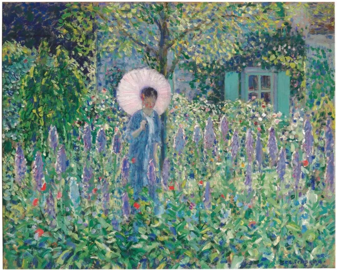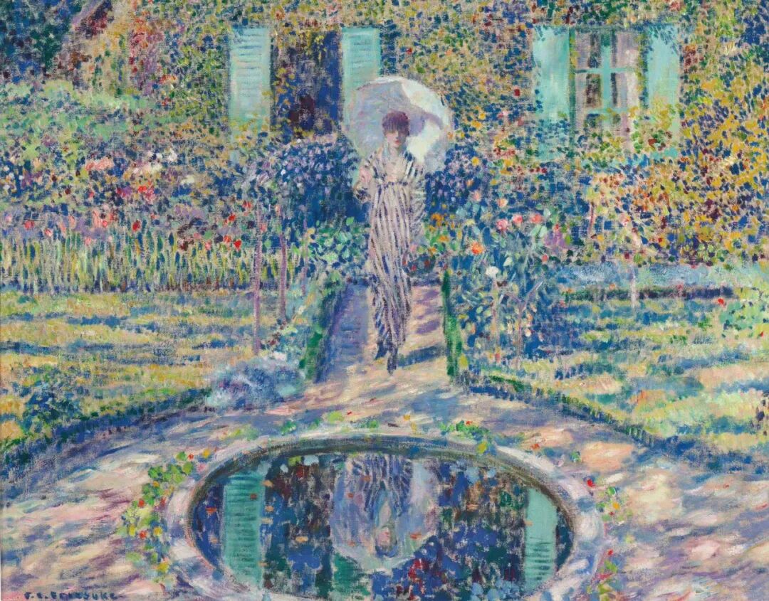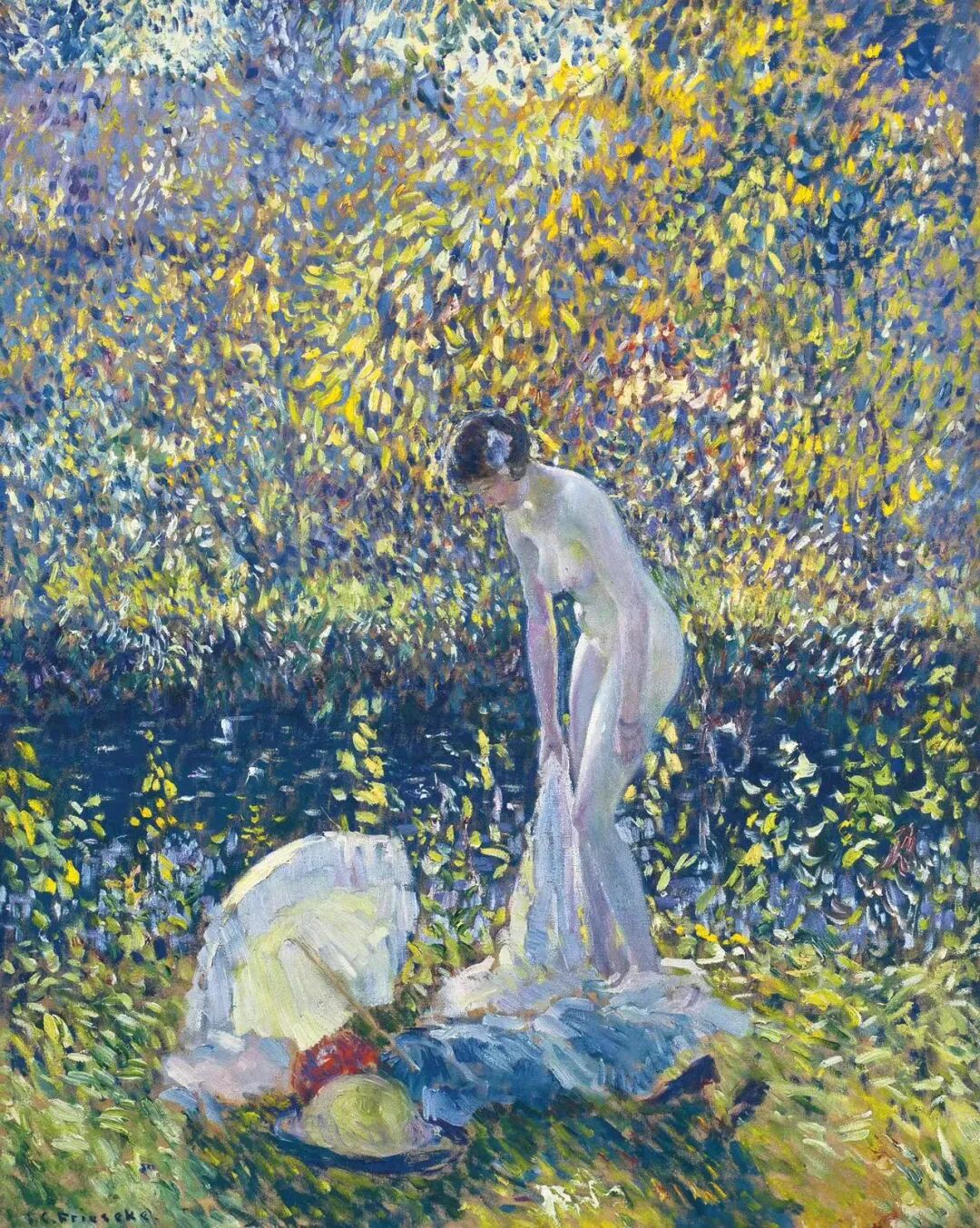 弗雷德里克·卡尔·弗里斯克(Frederick Carl Frieseke, 1874-1939),美国印象派画家,大部分时间在法国度过,许多作品集中表现斑驳阳光下的各种效果,尤其以描绘女性闻名。