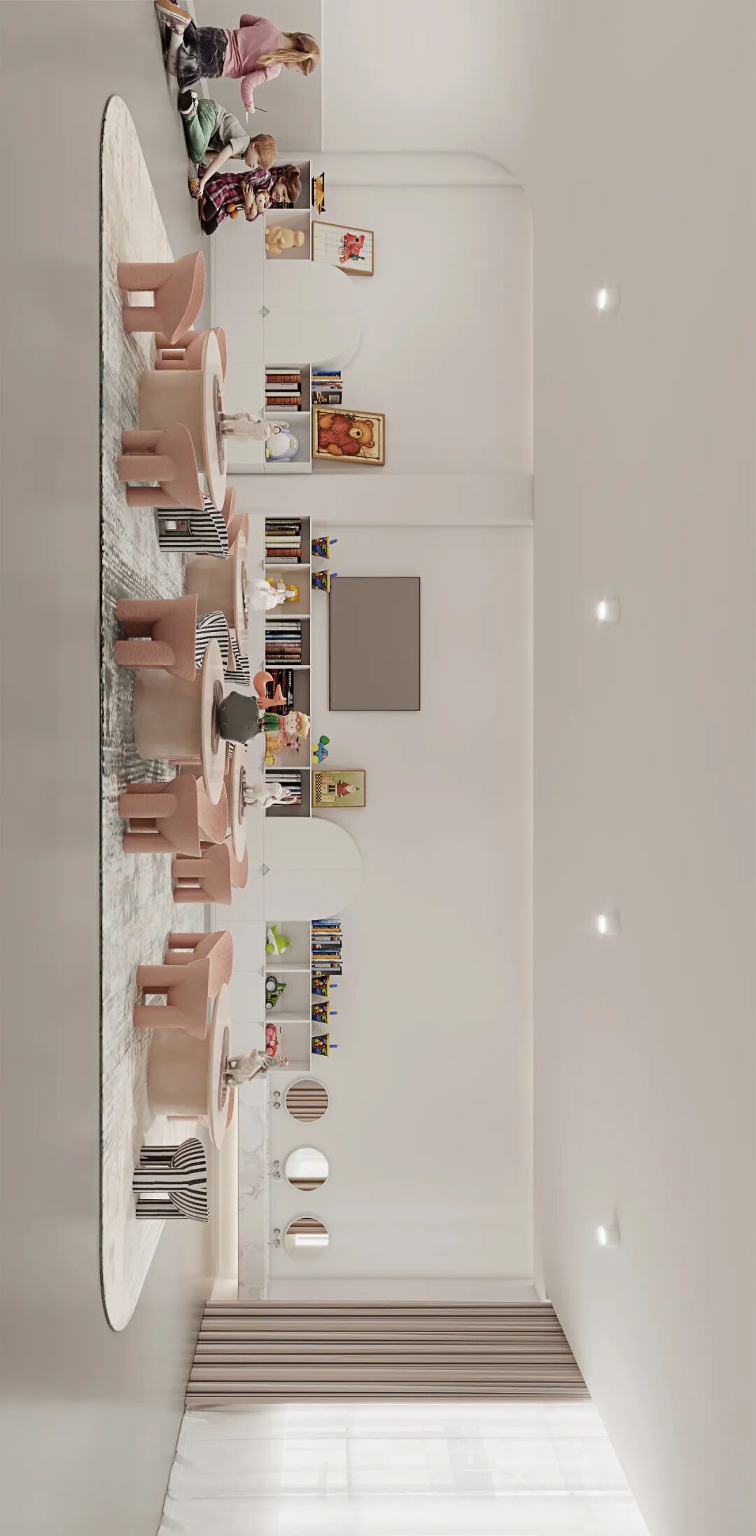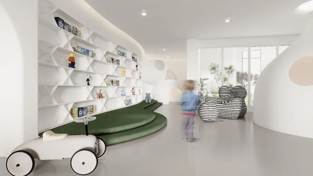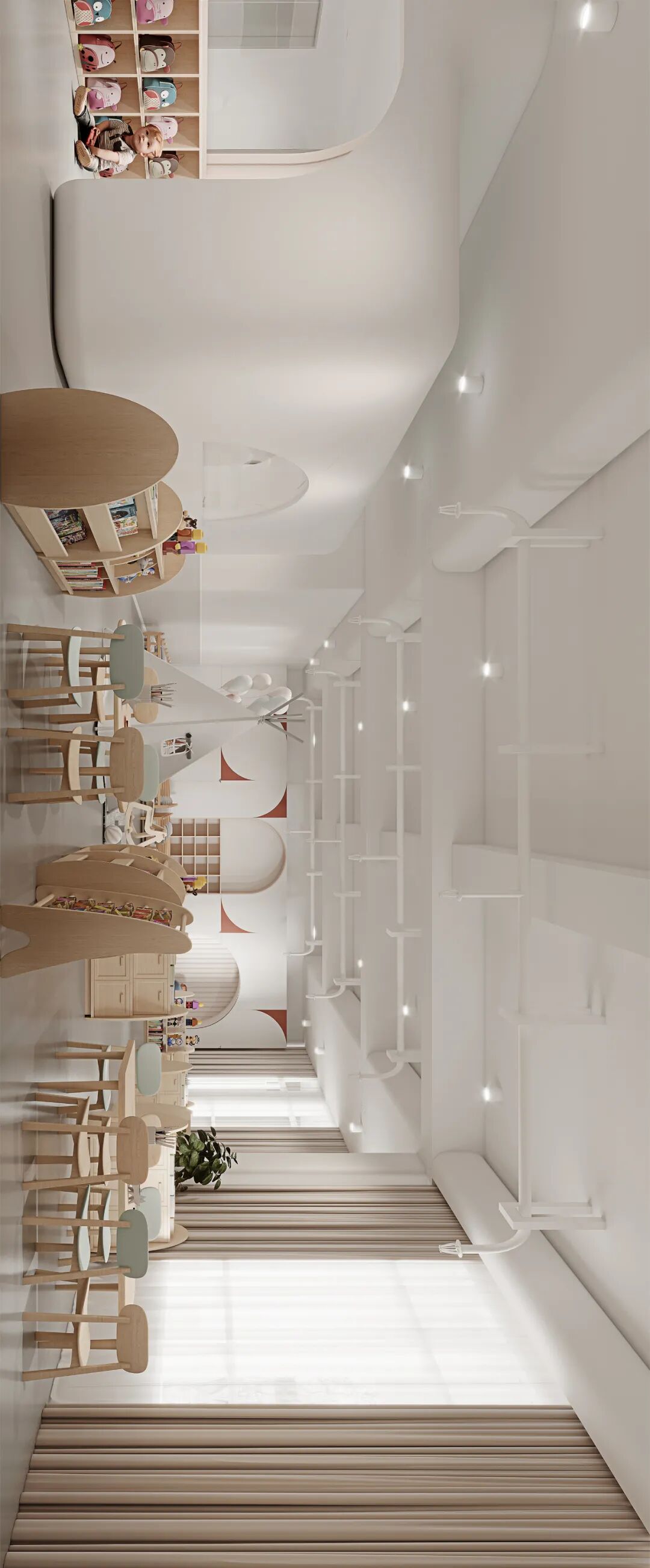 为了让孩子有一个良好的入园适应,我们结合了国内外知名教育学者对大脑神经科学和依恋关系研究,以及诸多知名托育园教育家的大量实践成果,整个空间表达紧紧围绕“以建立爱的链接、父母与孩子之间情感的交接、孩子心理、适应性、认知情况”为重要核心,采用层层递进的手法,用亲切的姿态和合理的形体表达,为孩子们营造出一个充满亲切、温暖、探索与开心的天堂。