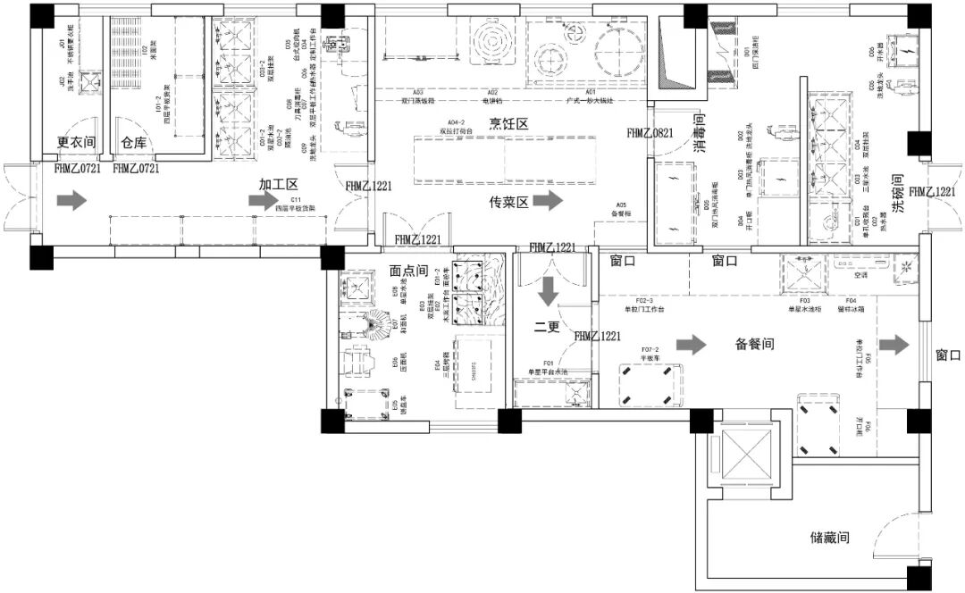 厨房区域功能分区明确,流线动态合理,规划分布达到省级A级食堂标准。