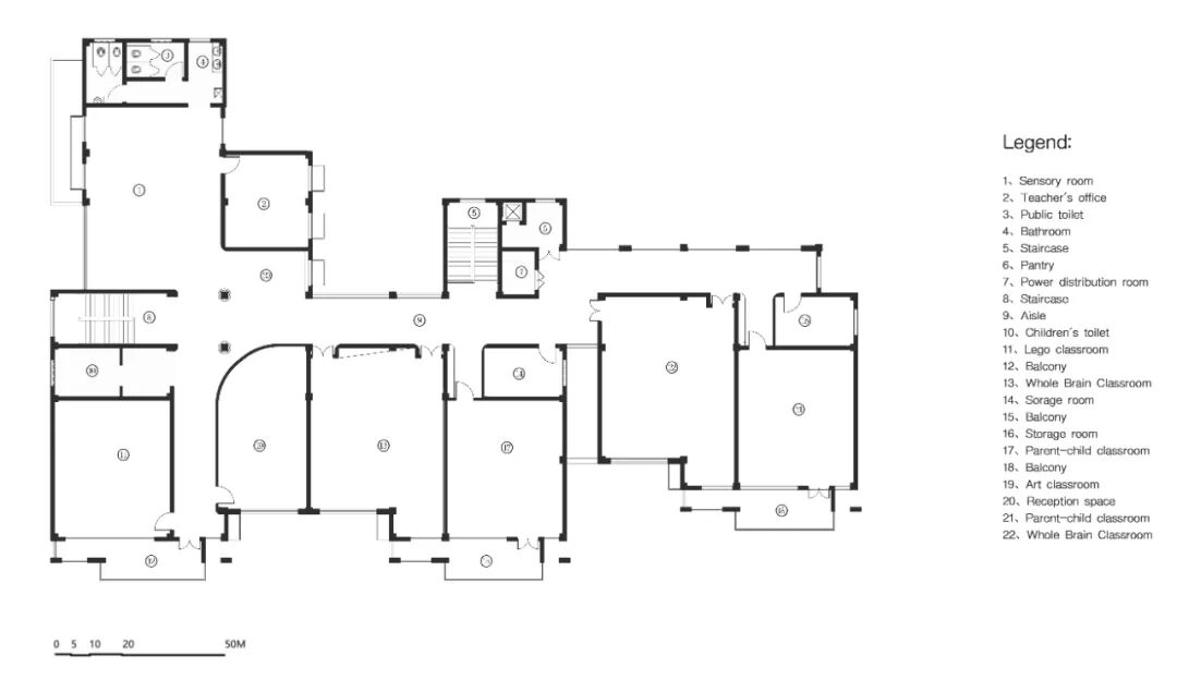 该建筑总层数为3层,原先性质为幼儿园,改造完成是一所面向0-3岁儿童的省级示范托育中心, 其中一层和二层区域为托育类的空间,三层为早教中心。