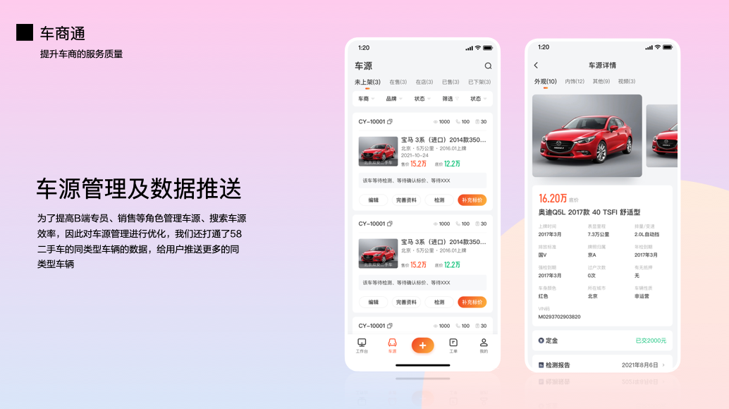 为了提高B端专员、销售等角色管理车源、搜索车源效率,我们对车源管理进行了优化。我们还打通了58二手车的同类型车辆的数据,给用户推送了更多的同类型车辆。对车源详情页也进行了优化改版,我们的车商对图片的依赖比较大,所以图片区域做了放大并可以滑动展示,车辆信息模块也做了展示调整,提升了商家用户体验。