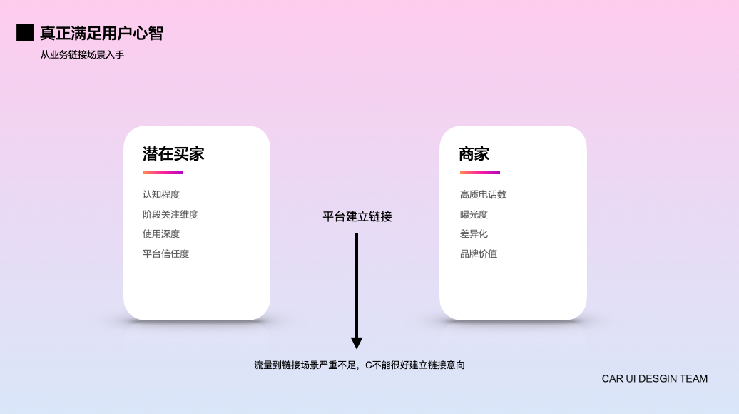 从业务链接场景入手,我们怎么能真正围绕用户的心智做设计呢?目前的痛点是流量到链接场景严重不足,C端不能很好的建立链接意向,那我们就需要通过一个平台将潜在买家和商家链接起来。