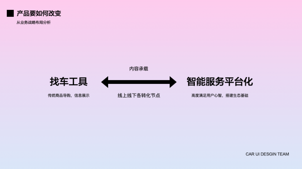 现在互联网的产品战略都在不断的升级优化,产品的形态也随之带来了新的变革。二手车业务大部分都是些常规信息平台,想要搭建成为增量全流程服务平台,还需要优化产品推荐策略,完善生态基础,才能带来更好的业务成长。