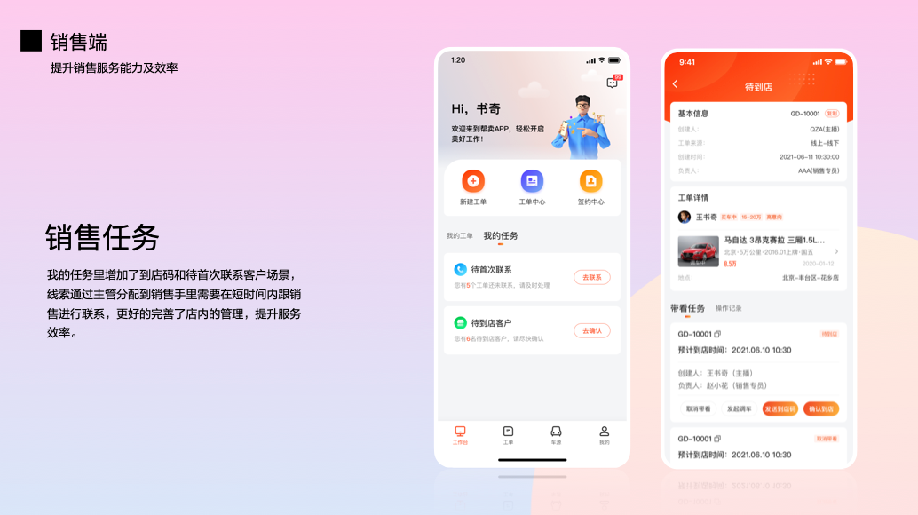 销售侧,我的任务里面增加了到店码和待首次联系客户场景,线索通过主管分配到销售手里,需要在短时间内跟销售进行联系,更好地完善了店内的管理流程,提升了服务效率。