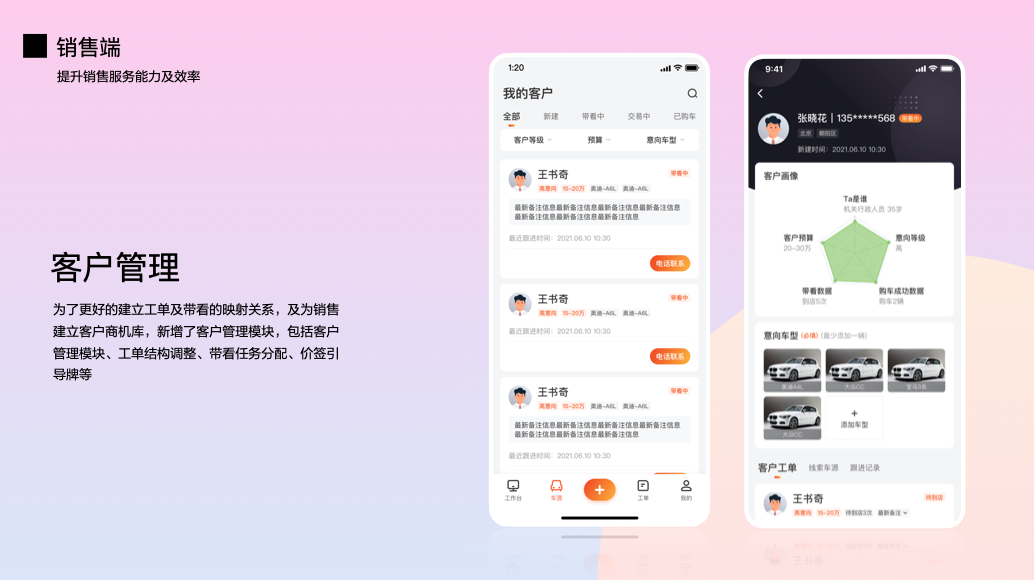 为了更好的建立工单与带看的映射关系,我们为销售建立了一个客户商机库,新增了客户管理模块、工单结构、带看任务分配、以及价签引导牌等。对工单的各个卡片模块进行了规范统一,提升了用户体验及效率。