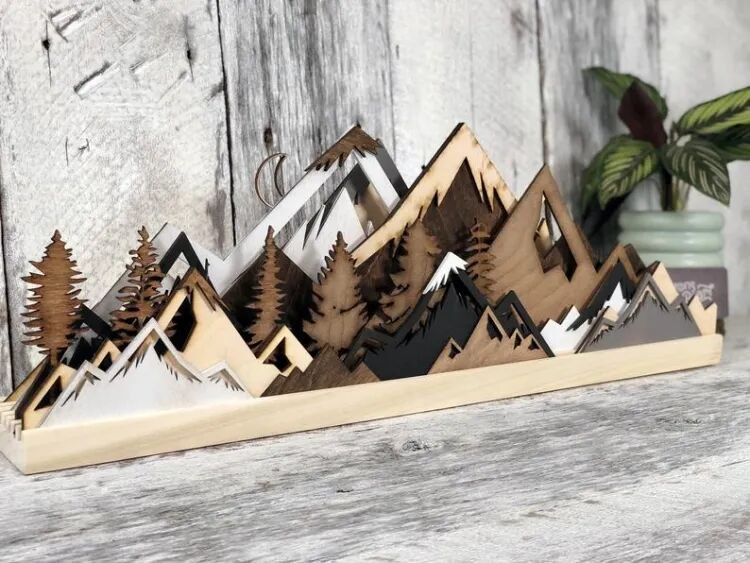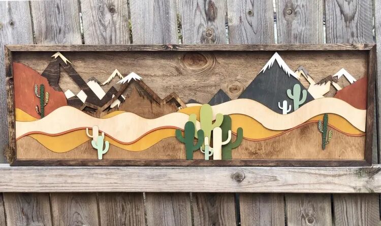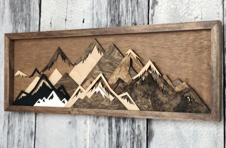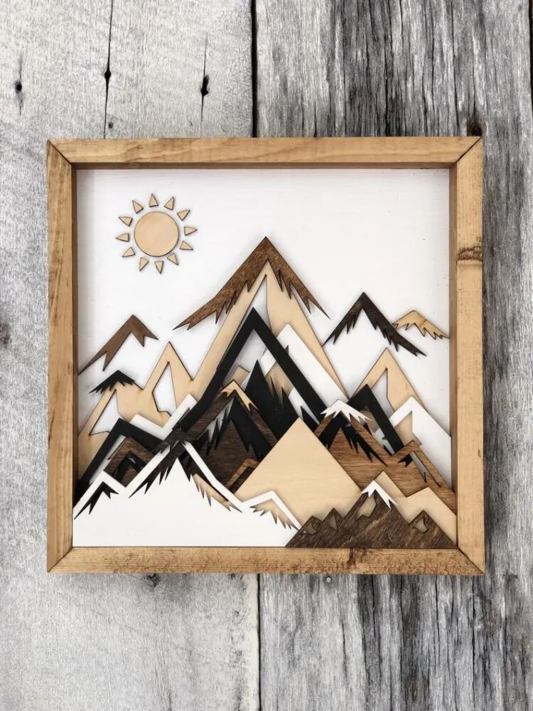 这种木板拼贴画类似于剪纸,介于工艺品和艺术品之间。原生的木块纹理和颜色,削弱了工艺感,增加了作品的艺术性。一块块木板经过精密的设计组合,最终形成类似3D视觉效果的山景作品。