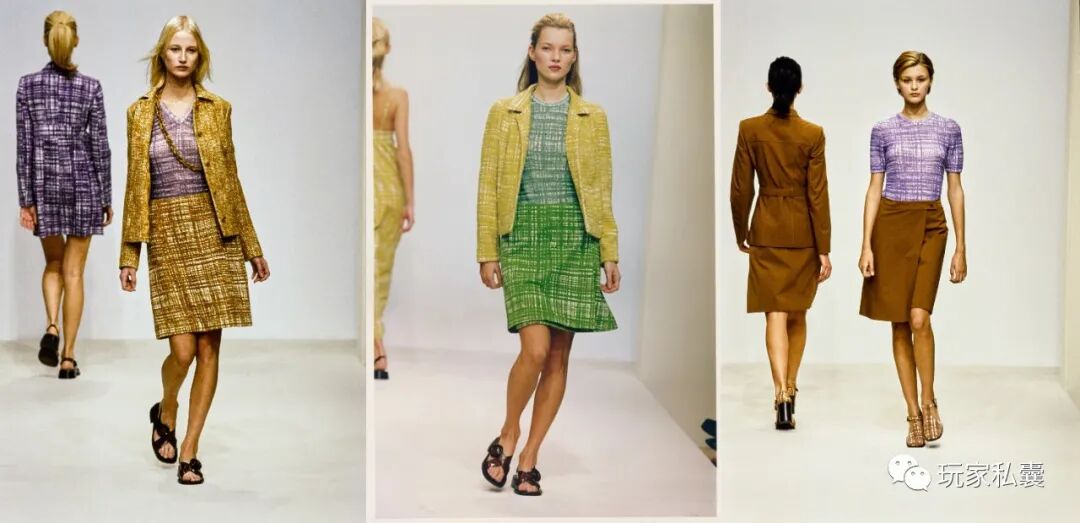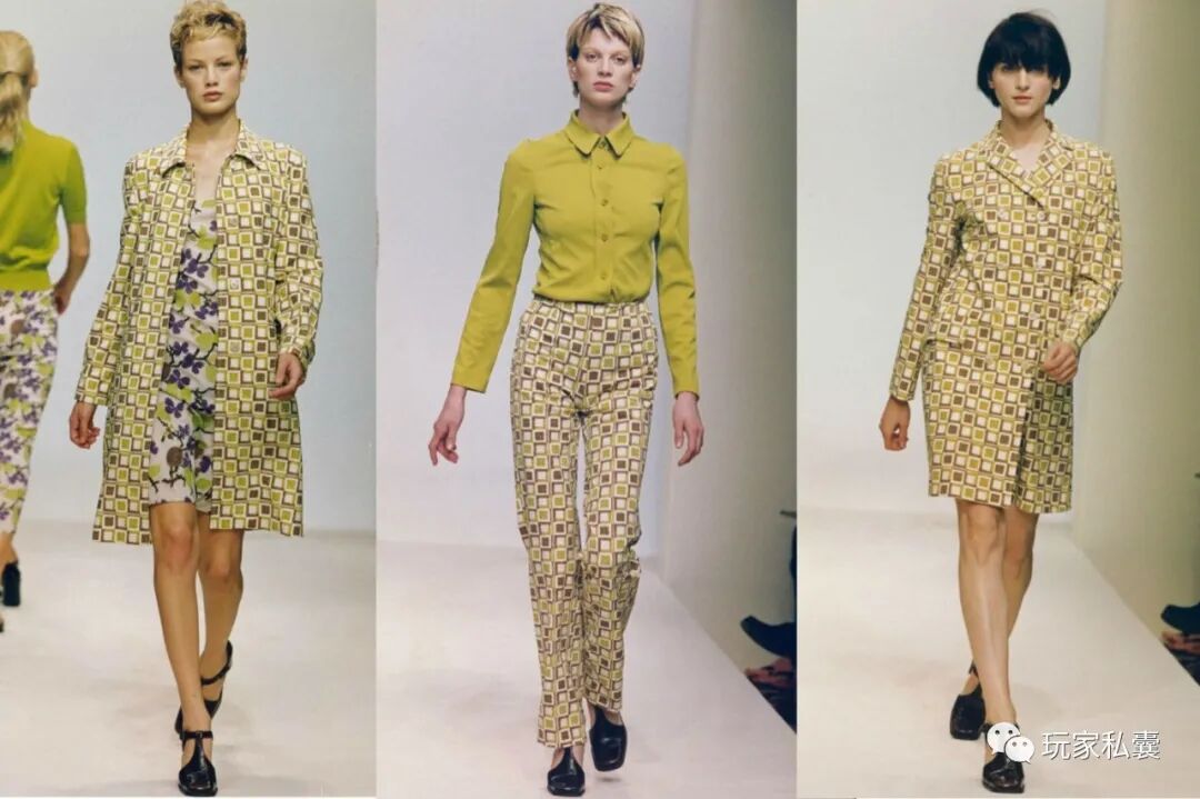 在 26年前的 Prada 1996 年春季系列“平庸的怪癖”中,可说MiuMiu最具影响力的作品之一。使用了大量来自1980 年代威尼斯双年展上生产的普通家居用品主题:一坨混合了鳄梨绿、铁锈和茄子紫等纯色色彩以手绘格子图案,被印在华达呢中长外套和铅笔裙上,设计灵感来自中世纪壁纸和厨房里缎面釉面瓷砖。