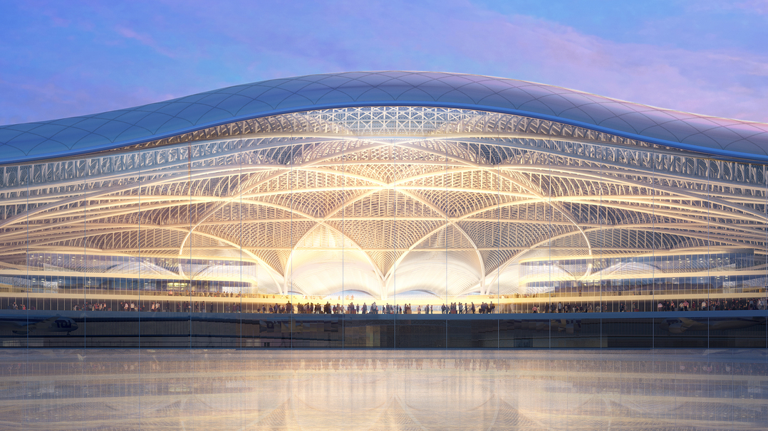 广场上方的拱形屋顶直观地将乘客从广场引向飞机。建筑由于水平变化小,布局既实用又灵活,可实现无缝客流和优化换乘,与周围景观的视觉联系也有助于定位。机场的设计也针对模块化和预制进行了优化,从而使交通枢纽能够适应不断变化的运营需求。