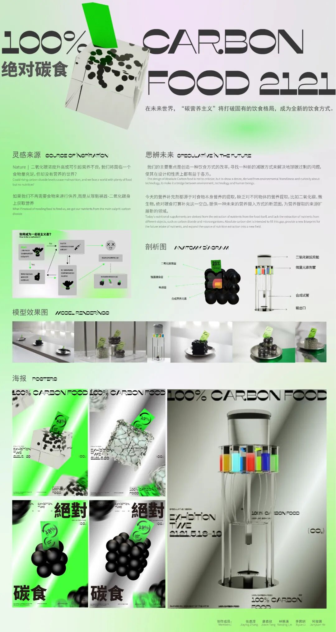 作品简介:根据杂志Nature指出,未来二氧化碳浓度升高或可引起营养不良。如果我们能够从罪魁祸首--二氧化碳中获取营养呢?今天的营养补充剂都源于对食物本身营养的提取,绝对碳食打算补充这一空白,提供一种新型的营养摄入方式,为营养提取的来源扩展新的领域。
