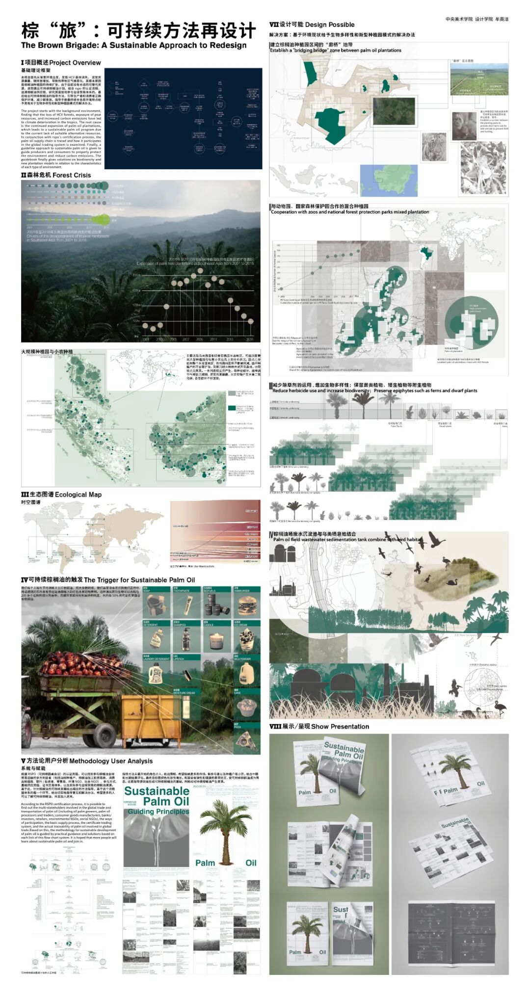 作品简介:本项目首先从背景环境出发,发现高保护价值的森林消失, 泥炭资源暴露,碳排放增加,导致热带地区气候恶化。其根本原因是棕榈油种植园的持续扩张,经过调研得知目前没有合适的可替代资源,进而提出可持续棕榈油计划,将目光聚焦于它的可持续性。结合 rspo 的认证流程,追溯棕榈油供应链,研究其是如何参与全球贸易体系的。最后给出可持续棕榈油的指导方法,引导生产者和消费者正确保护环境,减少碳排放。指导手册最终结合各类环境特点给予其有关于生物多样性和新型种植园模式的解决办法。