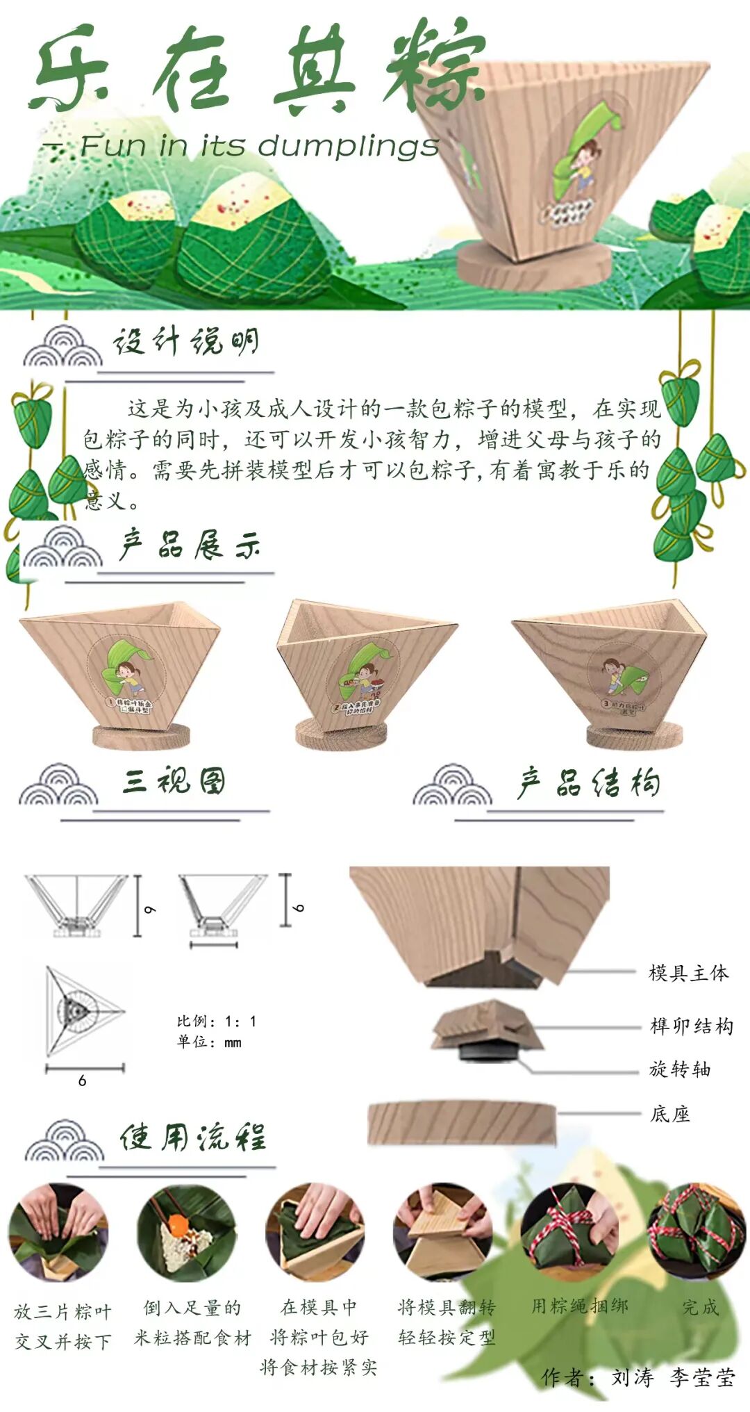 作品简介:这是一款为儿童设计的包粽子的模具,随着社会的发展很多传统文化及其手工艺都逐渐被淡忘,这款外观可爱的包粽子的模具可以激发孩子的好奇心,让他们想要了解中国传统文化,也可以让他们学习包粽子的手艺,提高智力,增加父母与孩子之间的互动。可以在吃粽子的同时享受包粽子的乐趣,又好玩又好吃。