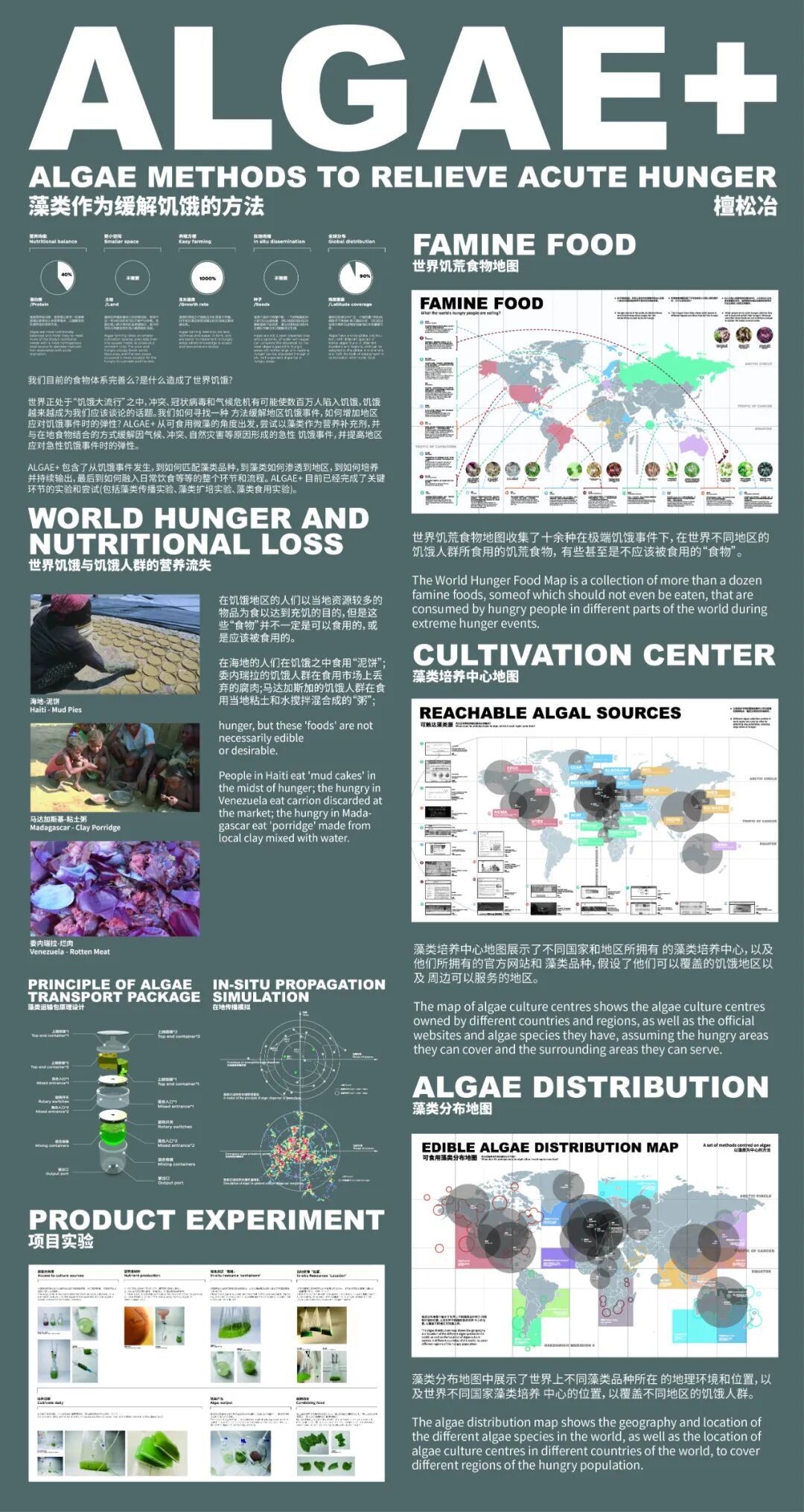作品简介:ALGAE+ 讨论了我们如何从藻类作为食物来源的视角介入到世界饥饿的问题当中,世界正处于“饥饿大流行”之中,冲突、冠状病毒和气候危机有可能使数百万人陷入饥饿,我们如何寻找一种系统性的方法缓解地区饥饿事件,增加地区应对饥饿事件时的弹性? 他从可食用微藻的角度出发,尝试以在地性可食用藻类作为营养补充剂,与在地食物结合的方式缓解因气候、冲突、自然灾害等原因形成的急性饥饿事件。流程包含了从饥饿事件发生,到如何匹配藻类品种,到藻类如何渗透到地区,到如何培养并持续输出,最后到如何融入日常饮食等等。