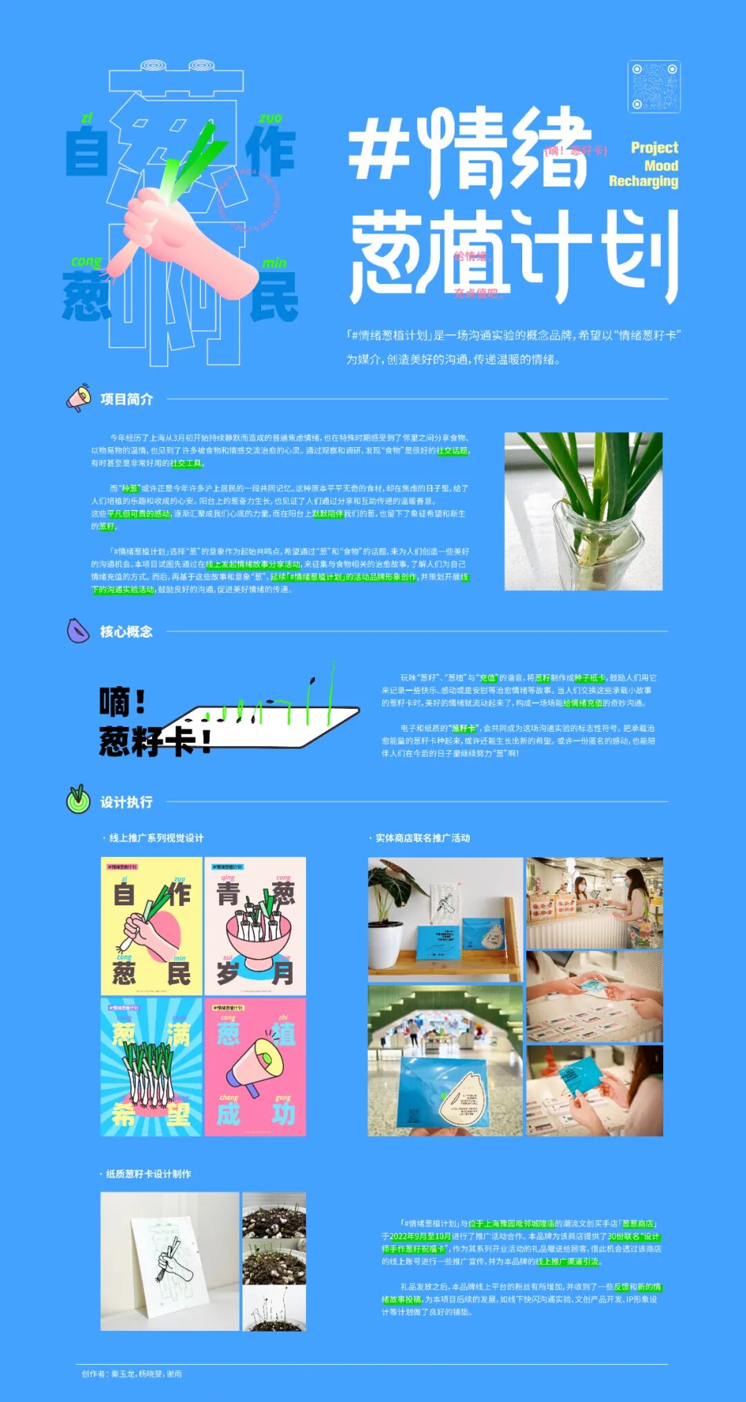 作品简介:本作品为基于菜市场新消费下亲子互动性食物教育的科普蔬菜品牌设计,通过设计进行普及蔬菜知识教育,引导减少食物浪费行为,拉近代际关系,强化菜市场导视系统从而提升亲子购物体验,创造良好的科普氛围。