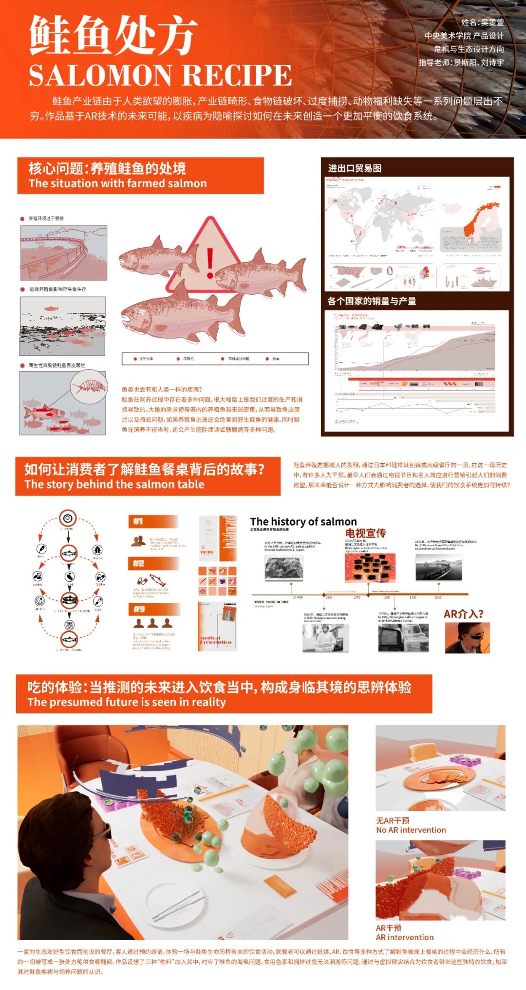 作品简介:鲑鱼产业链由于人类欲望的膨胀,产业链畸形、食物链破坏、过度捕捞、动物福利缺失等一系列问题层出不穷。作品基于AR技术发展的可能,以疾病为隐喻探讨了未来如何用虚拟现实技术结合饮食来展现食品背后的危机与可能,从而影响消费者对食物的选择。