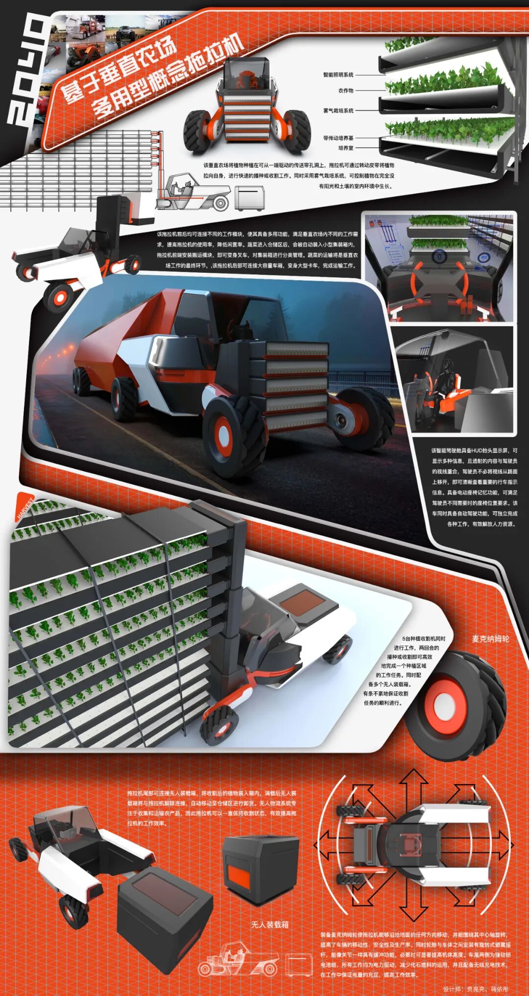 作品简介:到2050年世界百分之80的人口都将生活在城市里,要解决这些新增城市人口的食物保障问题,垂直农场可能会成为人类的一种选择。该垂直农场将植物种植在可从一端驱动的传送带孔洞上,拖拉机可通过转动传送带将植物拉向自身,进行快速的播种或收割工作。