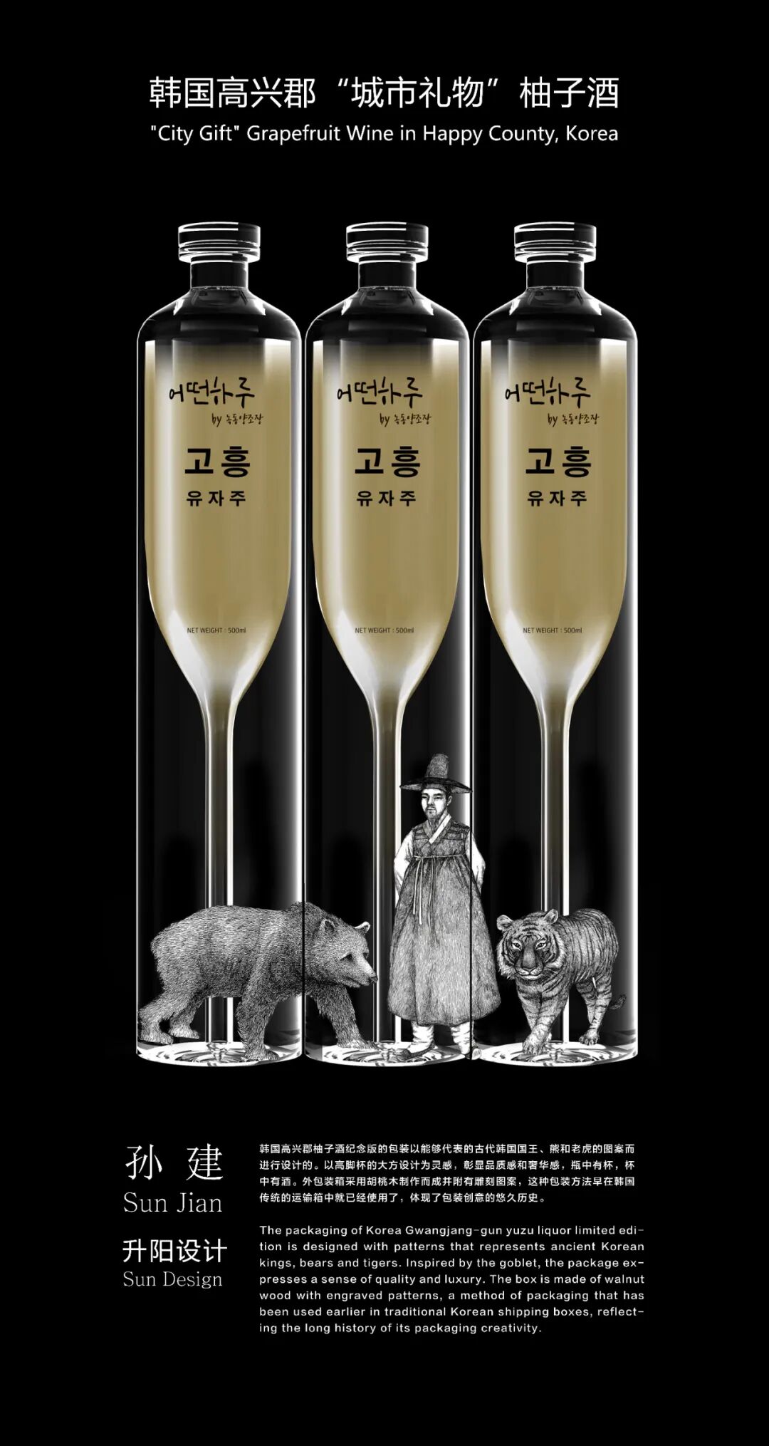 作品简介:韩国高兴郡柚子酒纪念版的包装以能够代表的古代韩国国王、熊和老虎的图案而进行设计的。以高脚杯的大方设计为灵感,彰显品质感和奢华感,瓶中有杯,杯中有酒。外包装箱采用胡桃木制作而成并附有雕刻图案,这种包装方法早在韩国传统的运输箱中就已经使用了,体现了包装创意的悠久历史。
