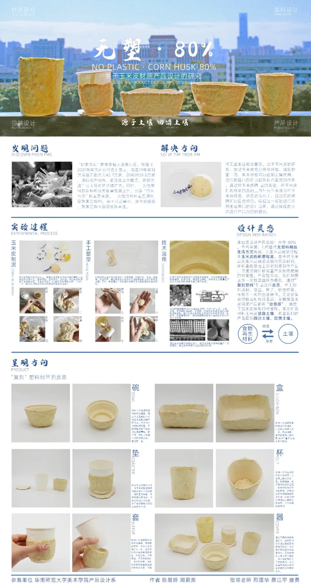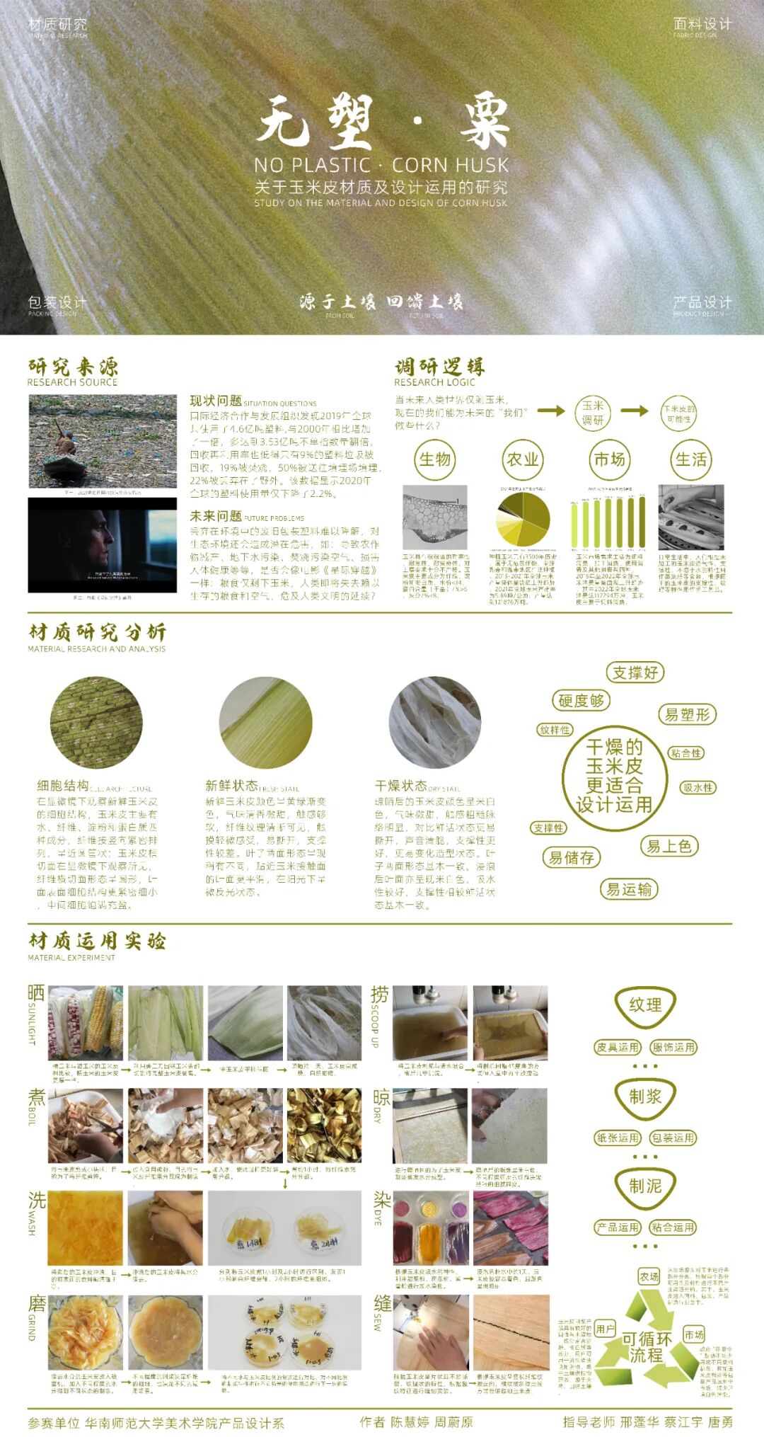 作品简介:对现有社会塑料污染现象进行反思,受电影《星际穿越》中地球人类粮食告急仅剩玉米的震撼,我们开始对玉米相关材质进行研究实验。经过调研,玉米皮大量出现在人类日常生活中没有充分利用起来;根据玉米皮特性,我们对其进行材料分析、面料纹理、制浆造纸包装、制泥产品运用的实验与研究。实验表明玉米皮能够作为面料、包装、生活产品的运用,结合现有工艺能够在我们的实验上量产化,并对其环保可降解的特性进行可循环流程的设计与展望。根据玉米皮在实验中的研磨程度进行命名,研究实验过程在反思与治愈中进行,我们希望将“无塑生活”概念更普及化,“来源土壤、回馈土壤”的想法希望让我们的生活材料对环境更友好,对人类未来更友善。