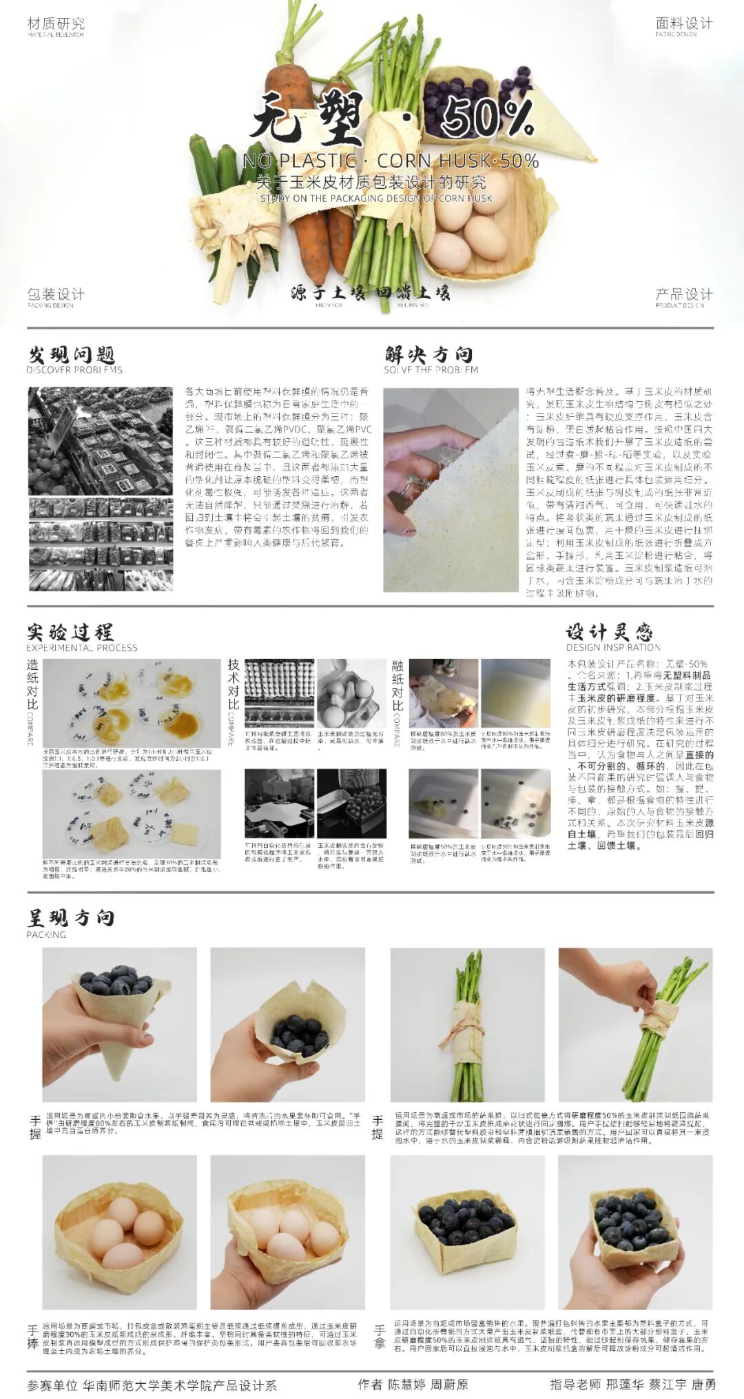 特色亮点:食品新材料-玉米皮材质运用与设计的研究,利用玉米皮制作成面料、包装、生活产品,对其进行可循环流程设计,“来源土壤、回馈土壤”。