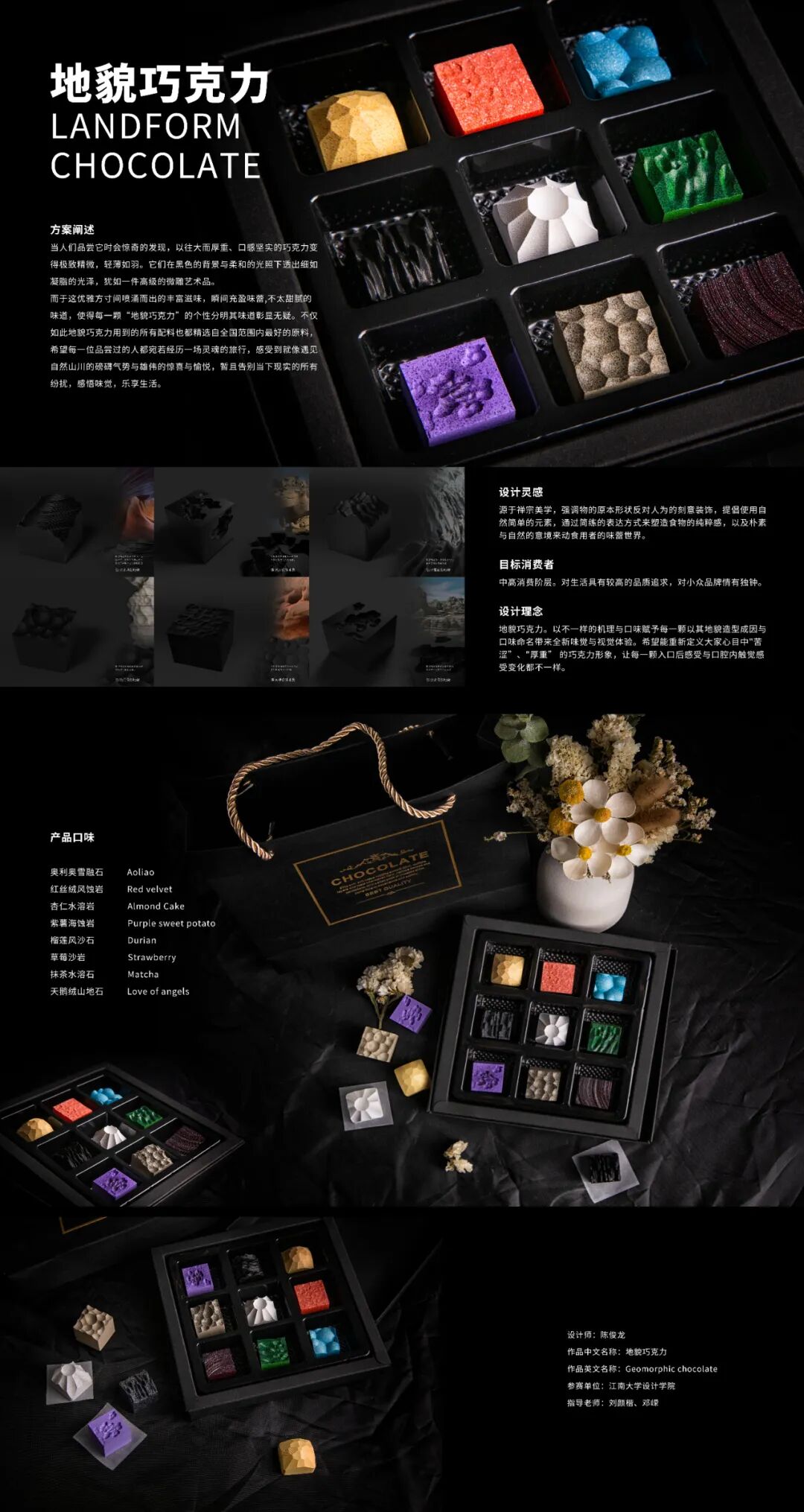 作品简介:《地貌巧克力》是一款针对年轻中高消费群体。对生活具有较高品质追求,对小众品牌情有独钟人群而设计的高级零食。其造型灵感源于禅宗美学所提倡的自然。通过简练意象的表达方式来塑造造型的纯粹感,根据自然的地形地貌特征来进行抽象造型提炼与甄别,造型借鉴自然界峡谷中受到自然风与流水侵蚀的岩层产生的层层肌理的峡谷地貌特征;借鉴高山积雪融水侵蚀的冰雪溶蚀地貌特征,还包括海滩侵蚀地貌、溶洞侵蚀地貌、风沙侵蚀地貌、流水侵蚀地貌等。“地貌巧克力”造型反对人为的刻意装饰,提倡使用自然简单的元素,通过简练的表达方式来塑造食物的纯粹感,以及朴素与自然的意境来打动食用者的味蕾世界。